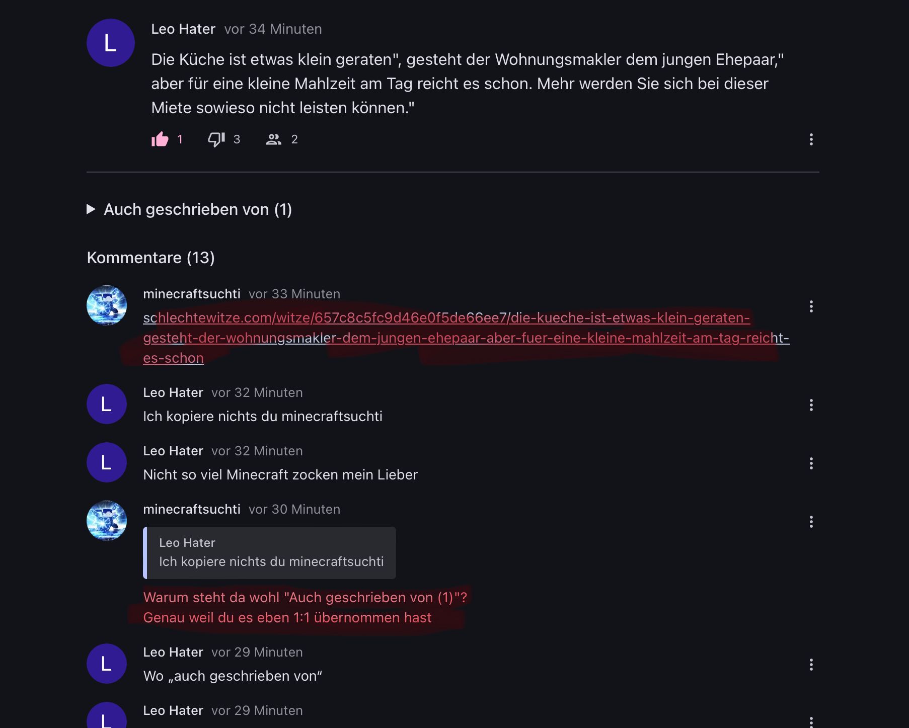 Dann schau bitte genau nach ob der Witz oder Meme schon exestiert und beschwere dich nicht wenn wer drunterschreibt das es denn schon gibt.