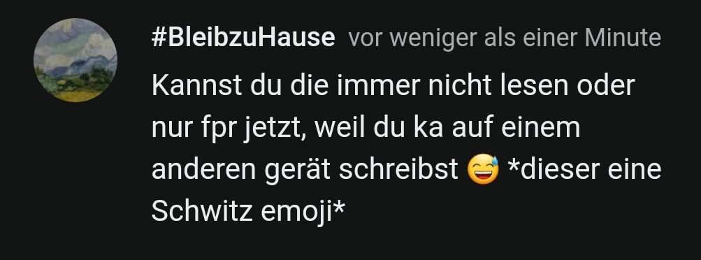 Kannst du die immer nicht lesen oder nur fpr jetzt, weil du ka auf einem anderen gerät schreibst 😅 *dieser eine Schwitz emoji*
