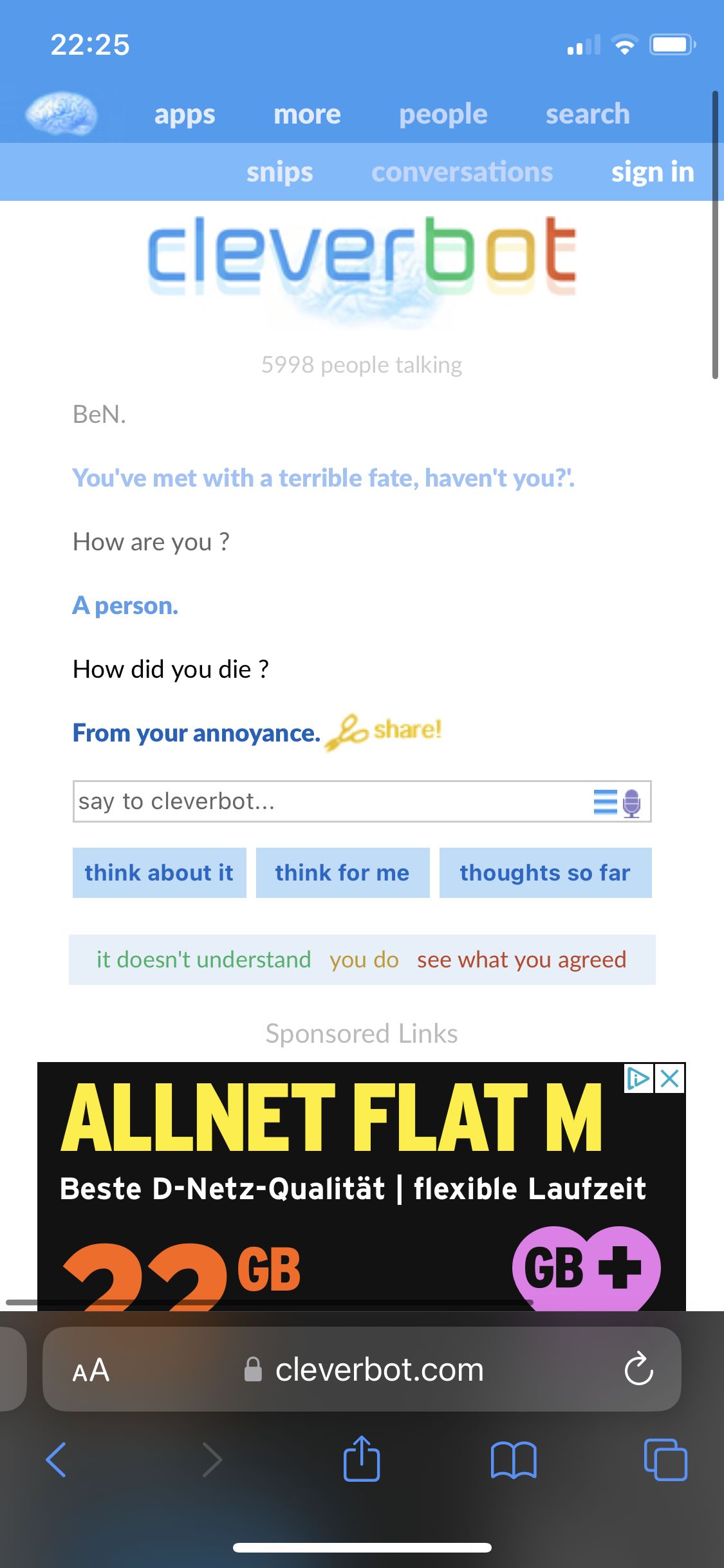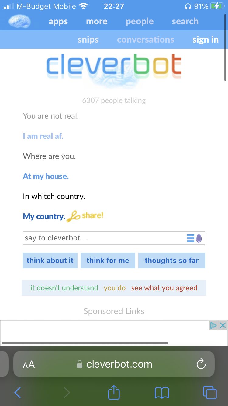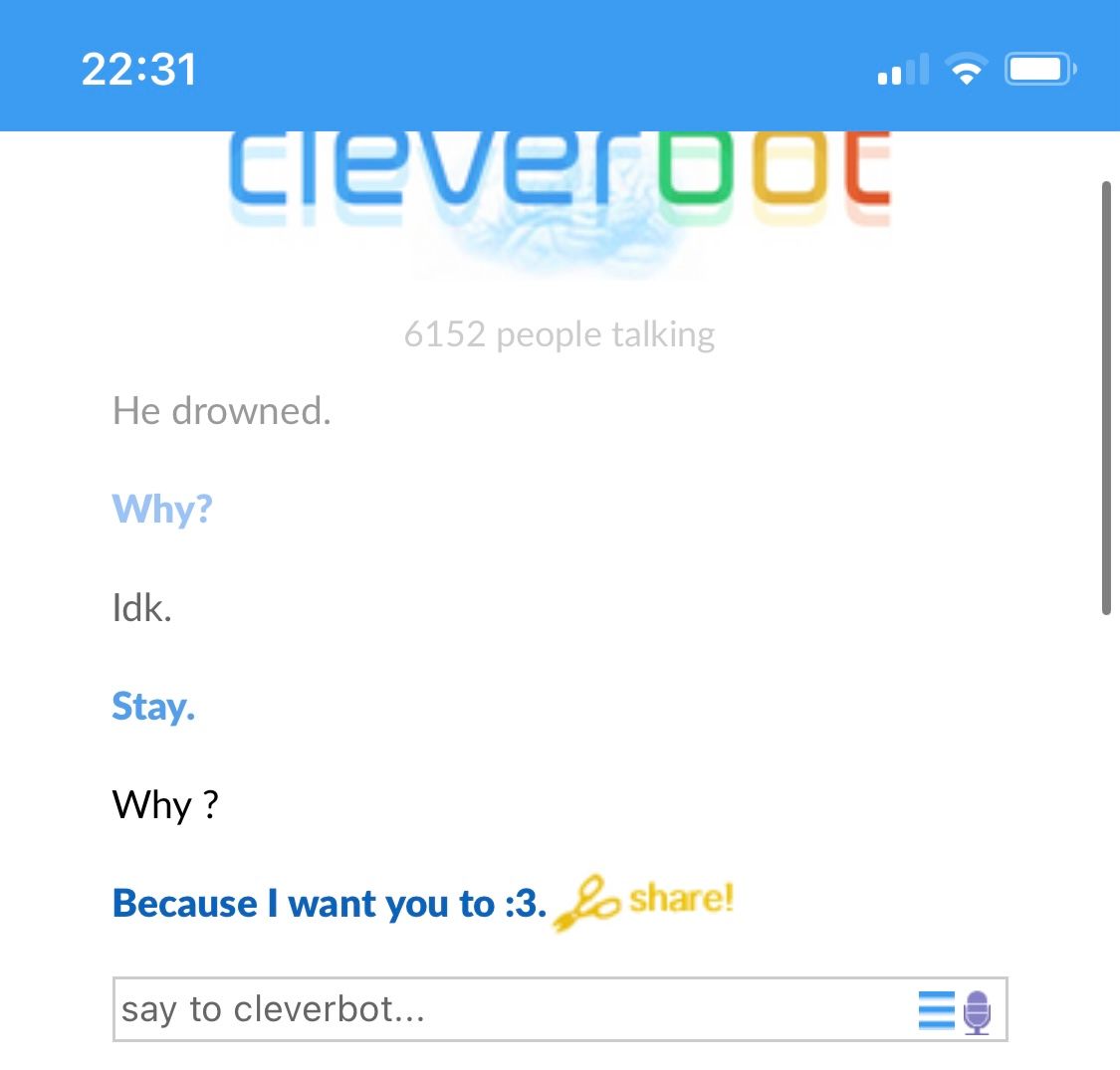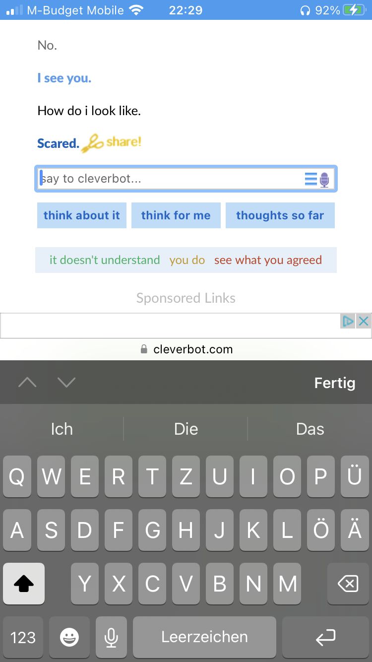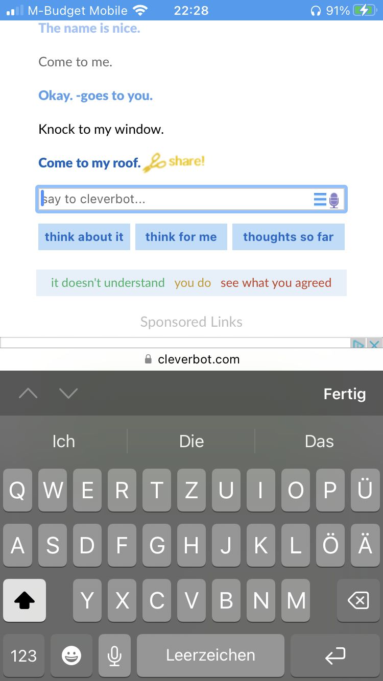Ich habe früher auch ein paar mal mit Cleverbot geschrieben. Er war meiner Meinung nach nicht der Klügste...