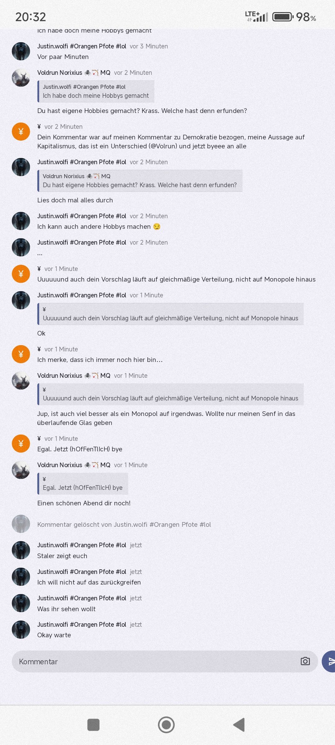 Dein Kommentar war auf meinen Kommentar zu Demokratie bezogen, meine Aussage auf Kapitalismus, das ist ein Unterschied (@Volrun) und jetzt byeee an alle