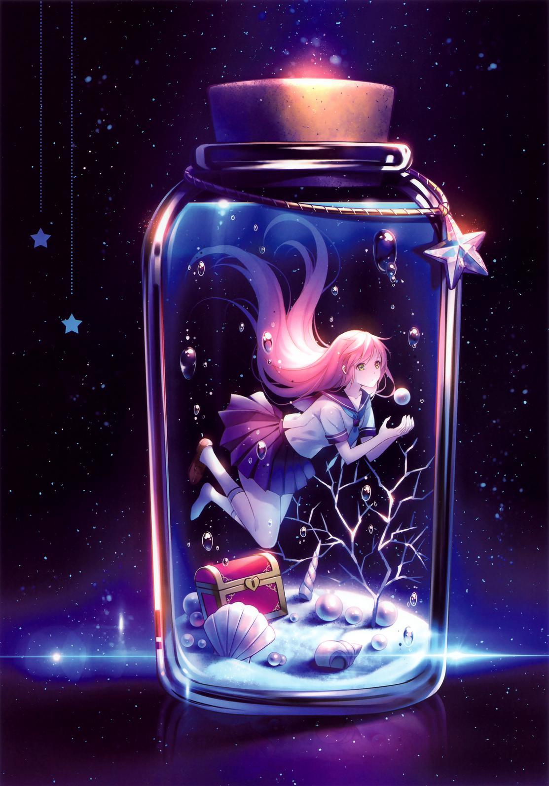 Die ist in einem Gläschen unterwasser, unten ist der Meeresgrund mit Sand, Muscheln, Koralle und einem Schatz