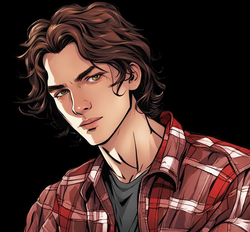 Also, blaue Augen; kurze, braune Haare, die so ein wenig mit den Händen zur Seite gestellt wurden (wenn du verstehst, was ich meine); ein grauer Hoodie; Kette