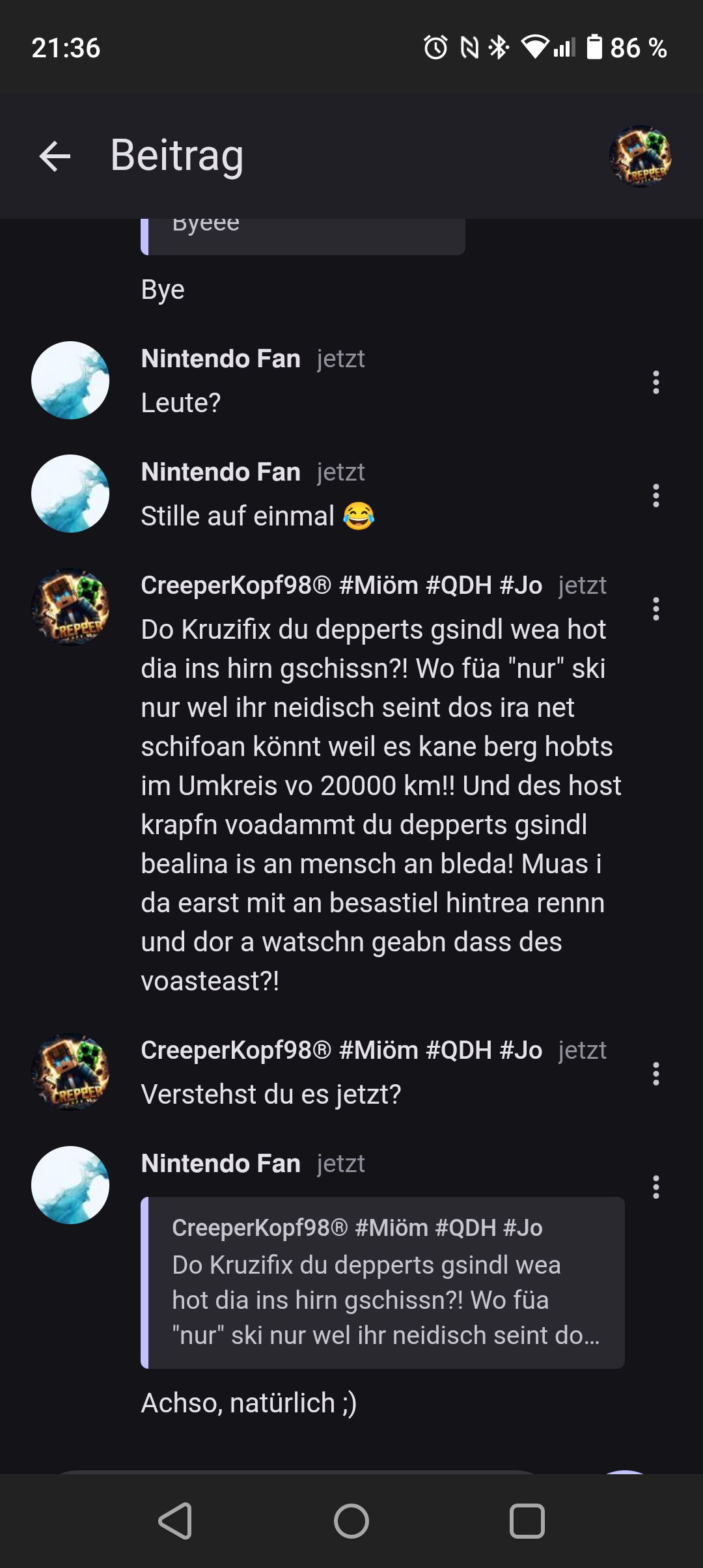 Früha hot Minecraftsuchti imma österreichische Wörter mit bracht aber jetzt schau i'n nur mehr voi selten ;((