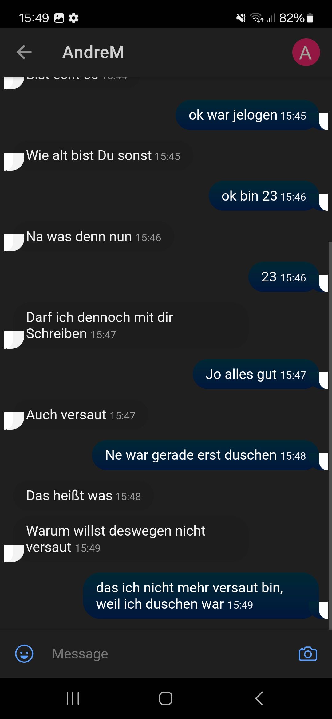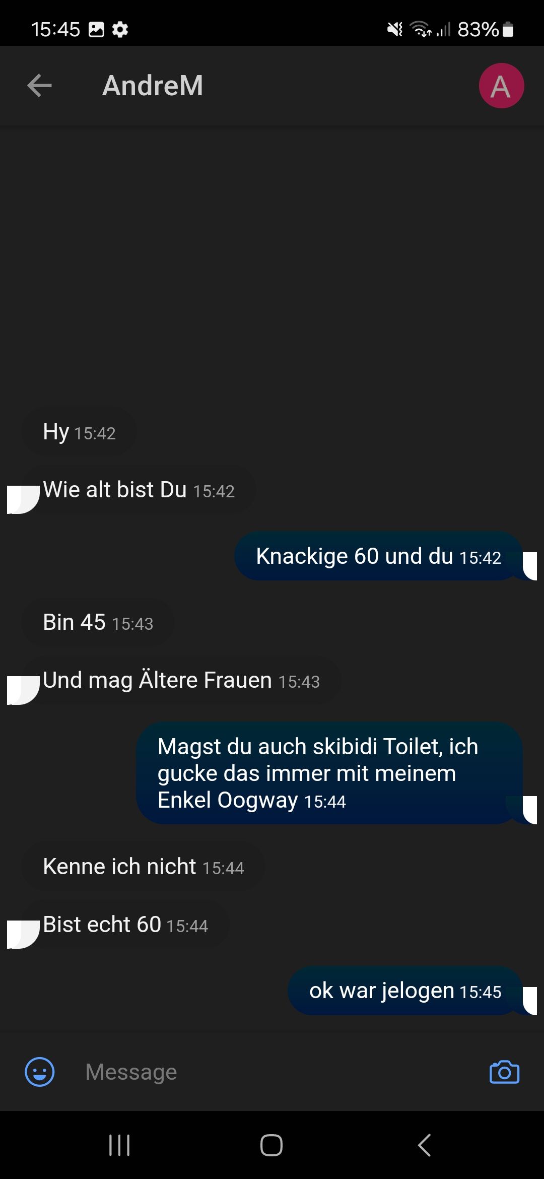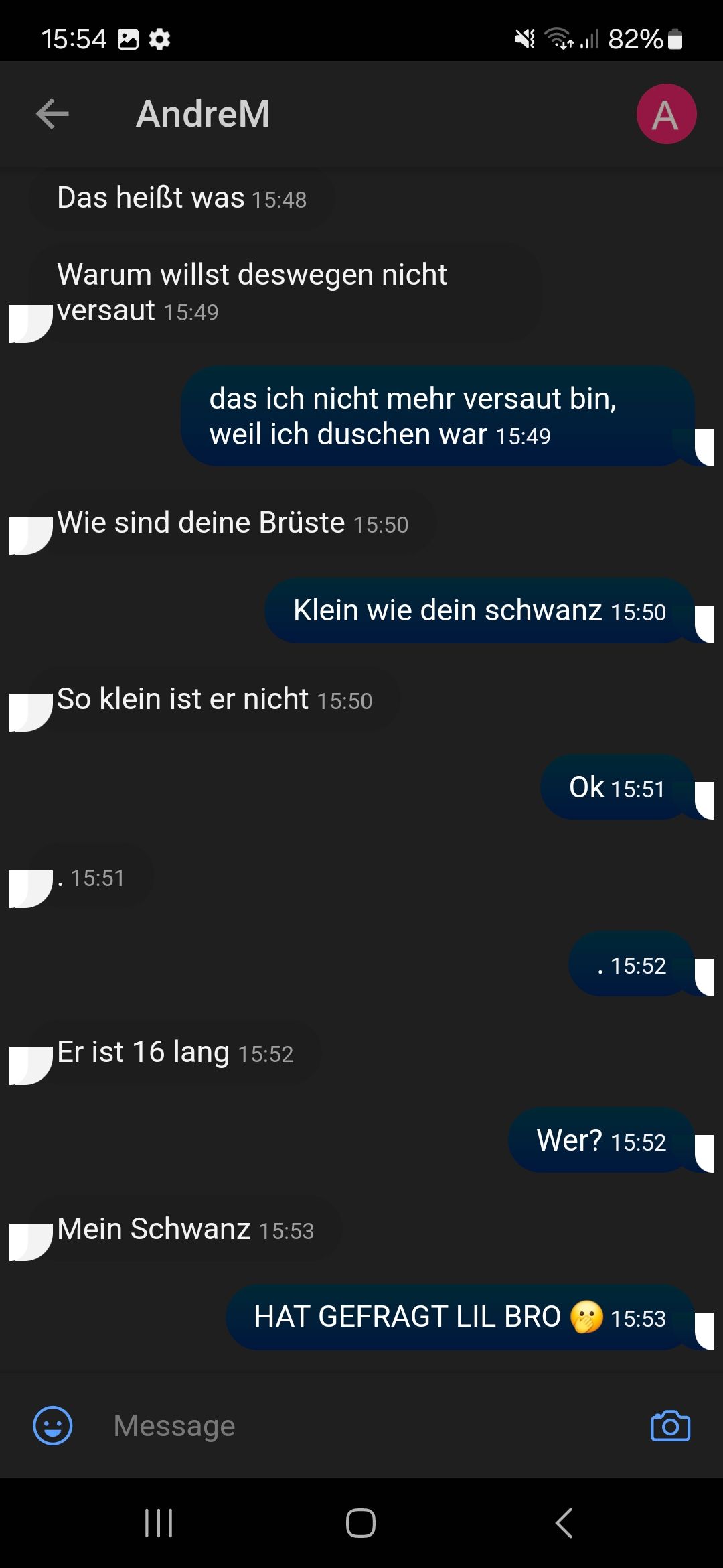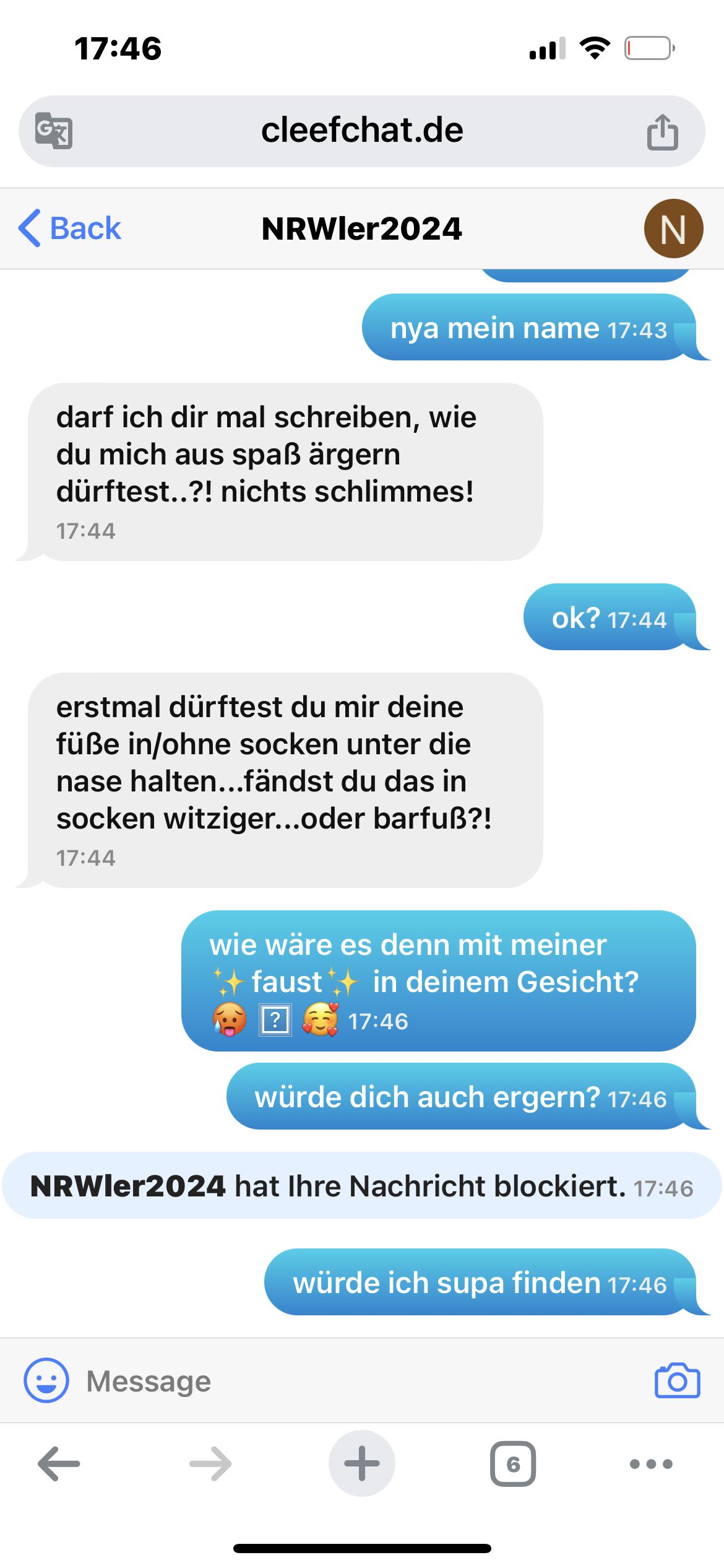 Ich hab auch mal jemandem sowas geschrieben. Der hat so gesagt, dass er mich sperren lässt. Außer ich schreibe mit ihm🗿