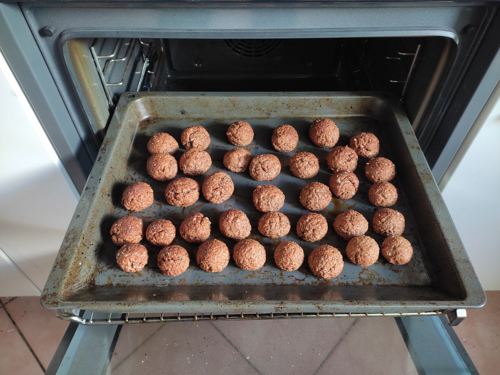 Das alles miteinander verrühren, eine Stunde im Kühlschrank fest werden lassen, und dann Bällchen daraus formen. Wenn ihr sie fleischbällchengroß macht, wie ich, dann werden es 36 Stück.