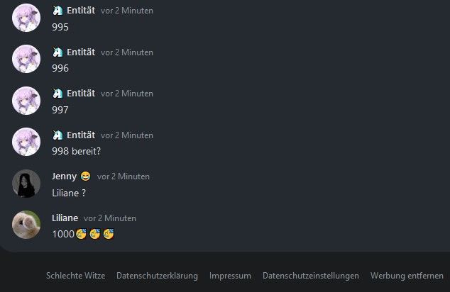 Dachte schon das ich ihn ausversehn gemacht hab 😅 weil ich schreib so >bereit Liliane ?< swipe hoch sehe 1000, ich dacht mir nur noch so NEIN ! 🤦🏻♀️ HAB ICH LILIANE DEN 1000 WEGGENOMMEN ??? Dann geh ich runter und sehe, dass du zum Glück 1000 geschrieben hast