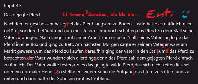 Nachdem er geschossen hatte viel das Pferd langsam zu Boden. Justin hatte es natürlich nicht getötet sondern betäubt und nun musste er es nur noch schaffen das Pferd zu dem Stall seines Vater zu bringen. Nach langer mühsamer Arbeit kam er beim Stall seines Vaters an legte das Pferd in eine Box und ging zu Bett. Am nächsten Morgen sagte er seinem Vater er wäre am Markt gewesen um das Pferd zu kaufen daraufhin ging der Vater in den Stall umd das Pferd zu betrachten der Vater wunderte sich allerdings denn das Pferd sah dem gejagten Pferd einfach zu ähnlich. Der Vater wollte testen ob es das gejagte wilde Pferd das sich nicht reiten lies sei oder ein normaler Hengst so stellte er seinem Sohn die Aufgabe das Pferd zu satteln und zu reiten und dann hatte der Sohn ein großes Problem...