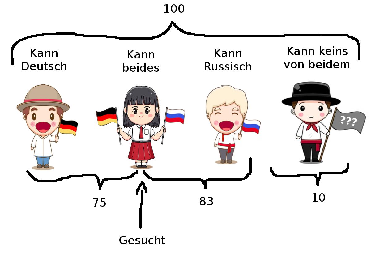 90 Leute können Deutsch und/oder Russisch, weil die anderen 10 keins von beidem können. Wie viele Leute von den 90 verbliebenen können NUR Deutsch? (d.h. kein Russisch?) -> 90 - 83 = 7 Wie viele können NUR Russisch (und kein Deutsch)? -> 90 - 75 = 15