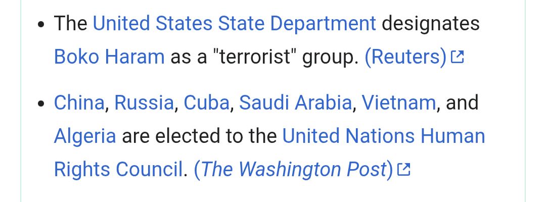 Was ist denn so schwer daran, das Bild zu lesen? Da steht's doch klar und deutlich: Die USA haben Boko Haram als Terrorgruppe eingestuft und China, Russland, Kuba, Saudi-Arabien, Vietnam und Algerien wurden in den UN-Menschenrechtsrat gewählt. Soll ich dir das auch noch vorlesen, oder was?