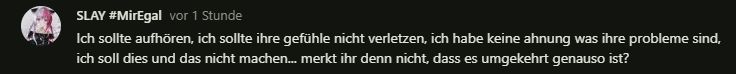 Bin direkt wieder weg, aber Slay, hör auf so zu tun, als wären BzHs Probleme nichts, nur weil du sie nd richtig kennst