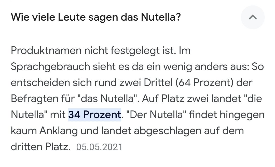 G4M3RUmfrage · vor 2 JahrenDer, die oder das Nutella?Der Nutella5 %Die Nutella57 %Das Nutella38 %37 Stimmen · Endergebnis