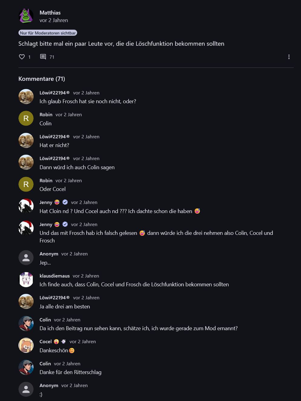 Und ich hoffe, damit wären deine Fehleinschätzungen mit "hat bei Matthias geschleimt, um Mod zu werden" dann auch ein für allemal geklärt.
