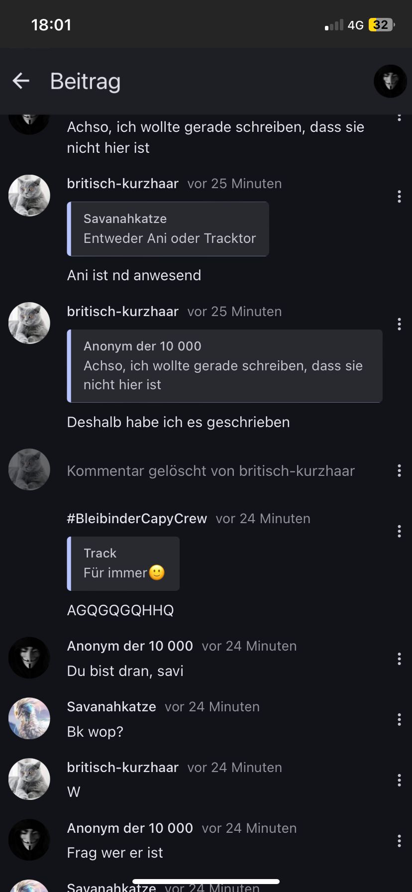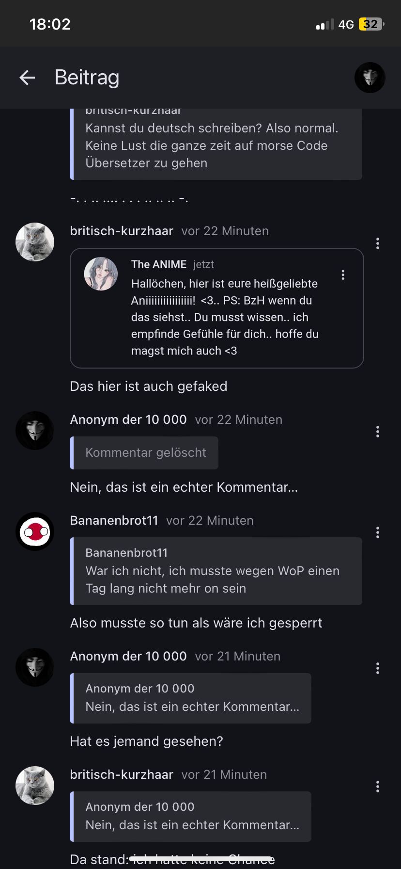 Hallo, ich wollte euch rasch mitteilen, dass der User @ britisch-kurzhaar bereits unter einem anderen Account registriert ist. Ich weiss leider weder wer er ist, noch gibt er es zu, aber er hat sich in einem Kommentar verraten, der mittlerweile gelöscht ist. Ich konnte aber zu Glück noch rechtzeitig einen Screenshot machen, den ich euch nachher zeigen werde. Angeblich hat er versehentlich auf löschen statt auf antworten gedrückt, weil es „einen Rechtschreibfehler darin hatte“. Er behauptet, der Screenshot wäre gefälscht, aber ich hoffe, ihr glaubt mir, dass ich so etwas nie tun würde, wenn es jemandem so schaden würde. Wie gesagt, ich schicke den Screenshot in die Kommentare. Sagt mir gerne eure Meinung dazu. Lg, anonym der 10 000