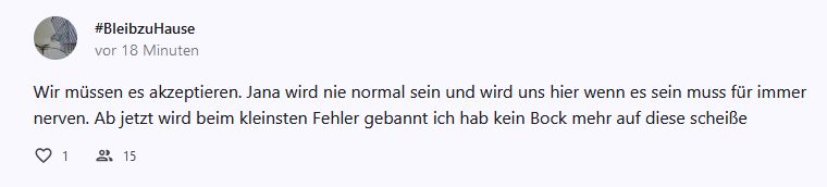 Wir müssen es akzeptieren. Jana wird nie normal sein und wird uns hier wenn es sein muss für immer nerven. Ab jetzt wird beim kleinsten Fehler gebannt ich hab kein Bock mehr auf diese scheiße