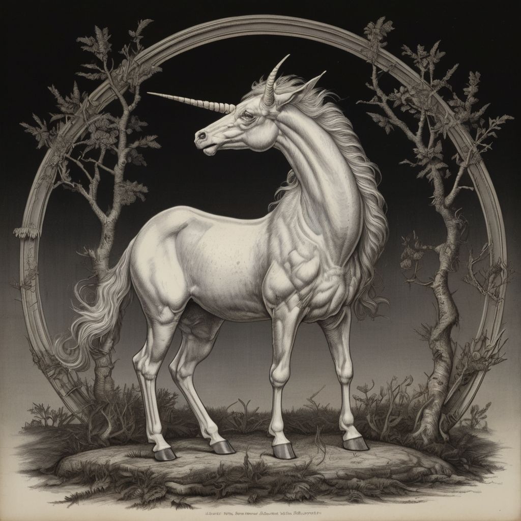 Ich habe zwei Ideen. Die erste wäre das Skelett eines Einhorns, in aufrechter, tänzelnder Haltung, so wie die üblichen, nur eben aus Gebeinen, das ganze in mattem Silber auf nachtschwarzem Hintergrund. Die zweite wäre auch auf schwarzem Hintergrund: Ein stilisiertes schwarzes Loch, Gold-Orange glühend, ringförmig, geflügelt mit den hellgrau angedeuteten Schwingen eines Rabens.
