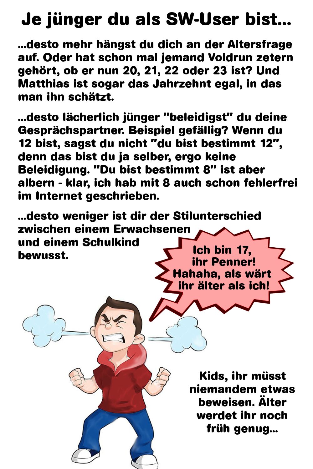 Ich verstehe zwar, dass z.B. "benehmen sich wie 8jährige" aus deinem Mund irgendwie komisch klingen würde, weil du das letztes Jahr ja selbst noch warst, also keine richtige Beleidigung. Aber man kann's auch übertreiben. So wie in dem Meme, das ich zu dem Thema gemacht habe.