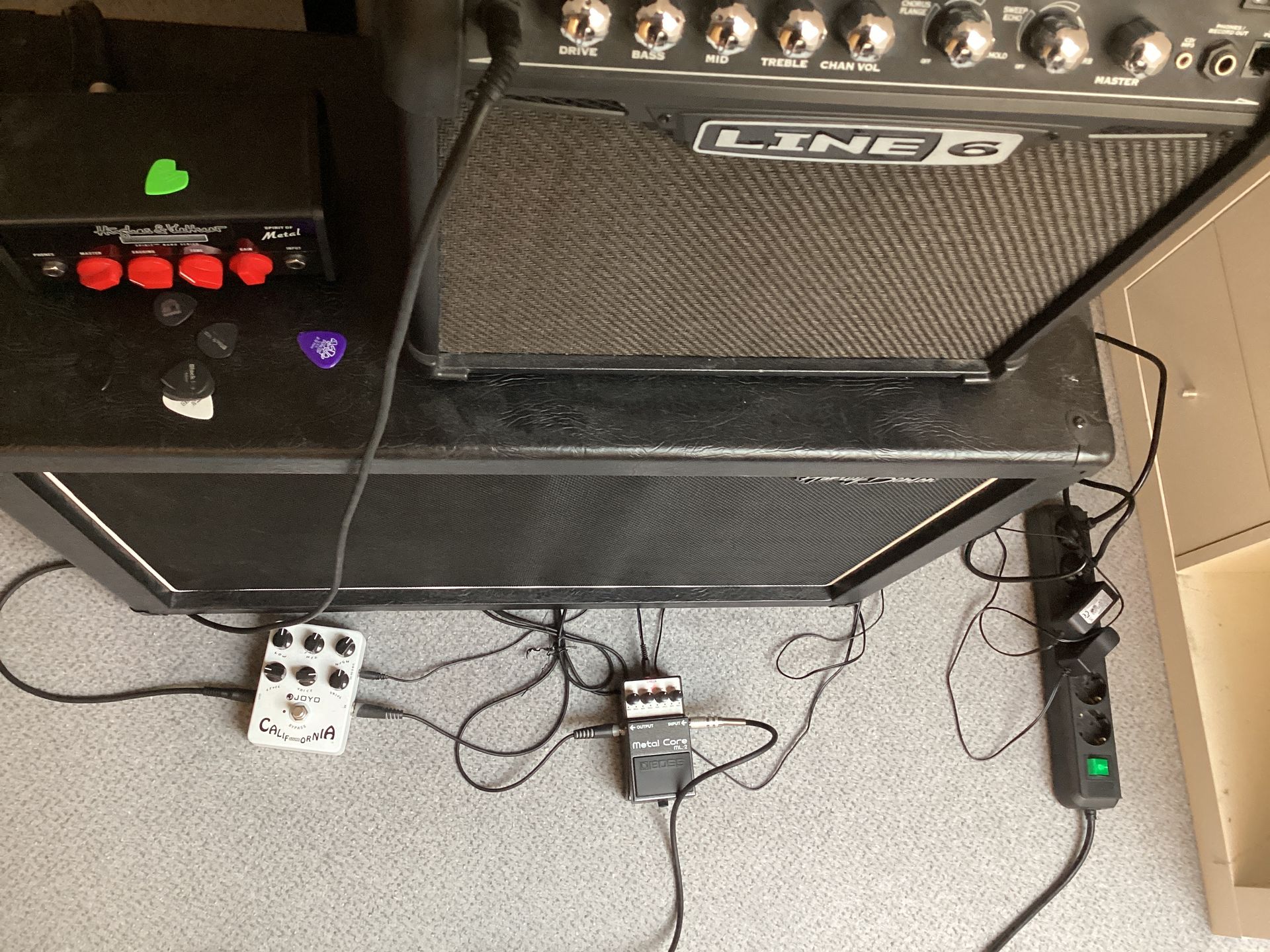 Die Box ist me Harley Benton G212 (die normale, man hat als Schüler nen begrenztes Budget), dazu hab ich nen Hughes&Kettner Spirit of Metal (auch dem begrenzten Budget geschuldet, aber bringt nen schönen neuen Charakter rein) und aktuell spiel ich über meinen Line 6 Spider 15 kombiniert mitm Boss ML2 Metalcore (geilste Tretmine aufm Markt ig)