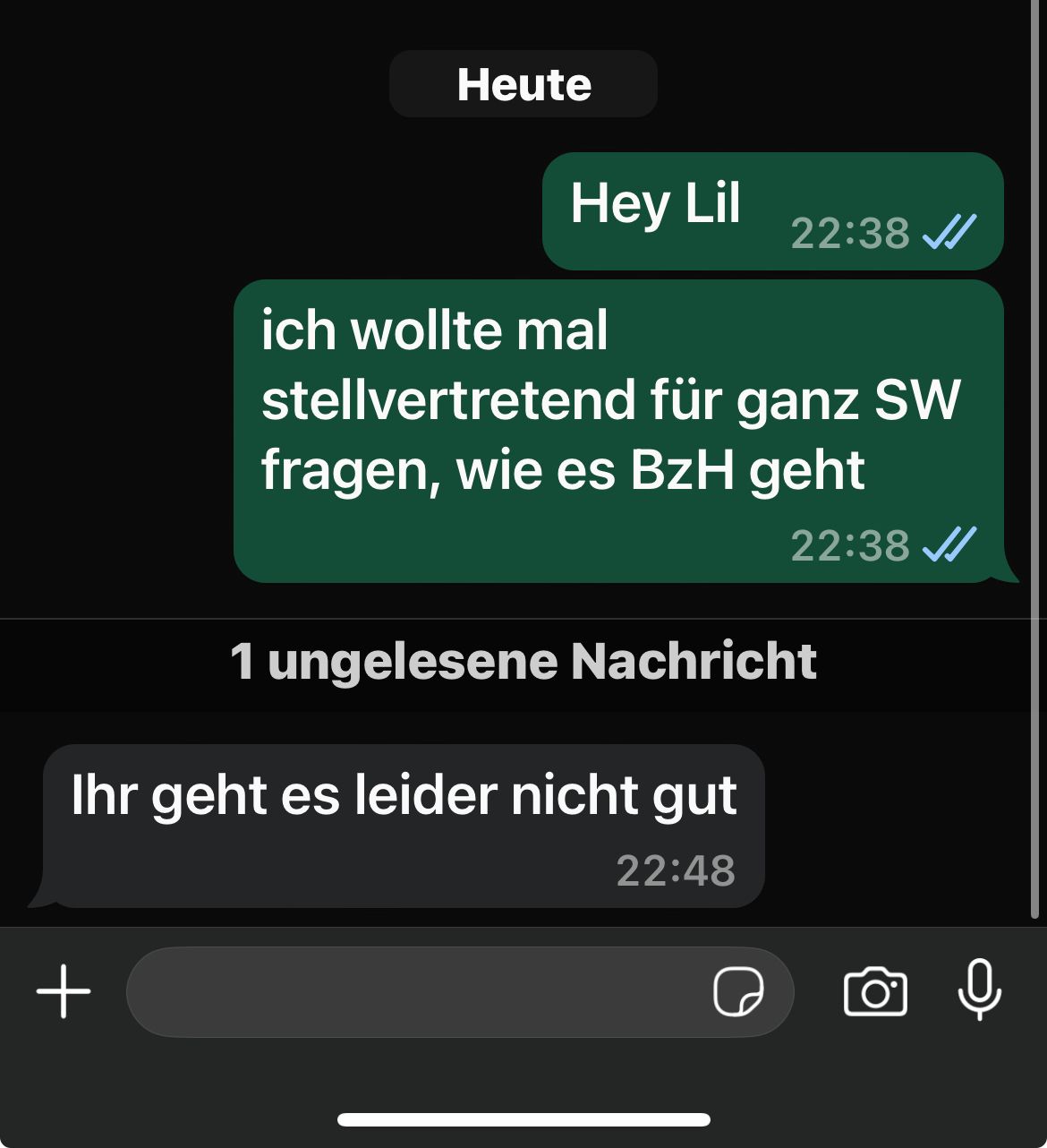Ein paar Tage oder so später hat sie alle von SW blockiert weil sie meinte, dass niemand wissen wollte wie es ihr geht