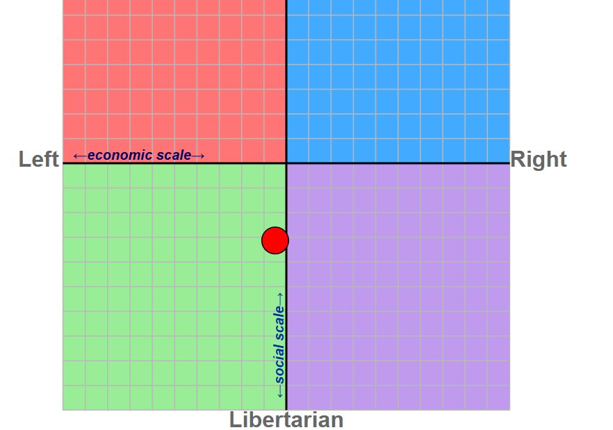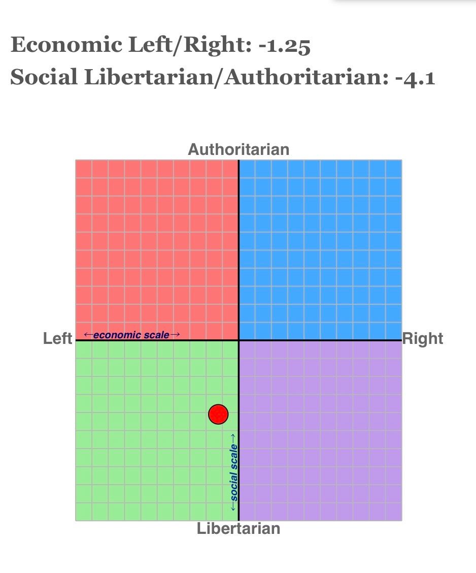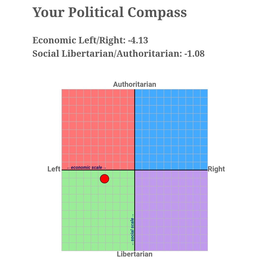 Sodele wir revealen jetzt mal den „politischen kompass“ von uns:3 Natürlich sagt dieser nicht alles aus, da er nur auf spezifischen fragen basiert, aber er gibt zumindest ne grobe Einschätzung eures politischen Standpunktes. Allerdings ist die Einschätzung nur auf Links/Rechts und Autoritär/Liberal eingeteilt, also es ist KEIN Parteienkompass. Jeder und jede kann niemand muss, aber wer nicht macht dem öhhm werfe ich ne mandarine an den kopf oder so👍 Link is unten