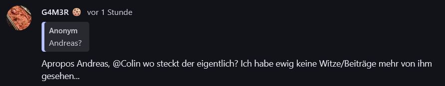 Apropos Andreas, @Colin wo steckt der eigentlich? Ich habe ewig keine Witze/Beiträge mehr von ihm gesehen...