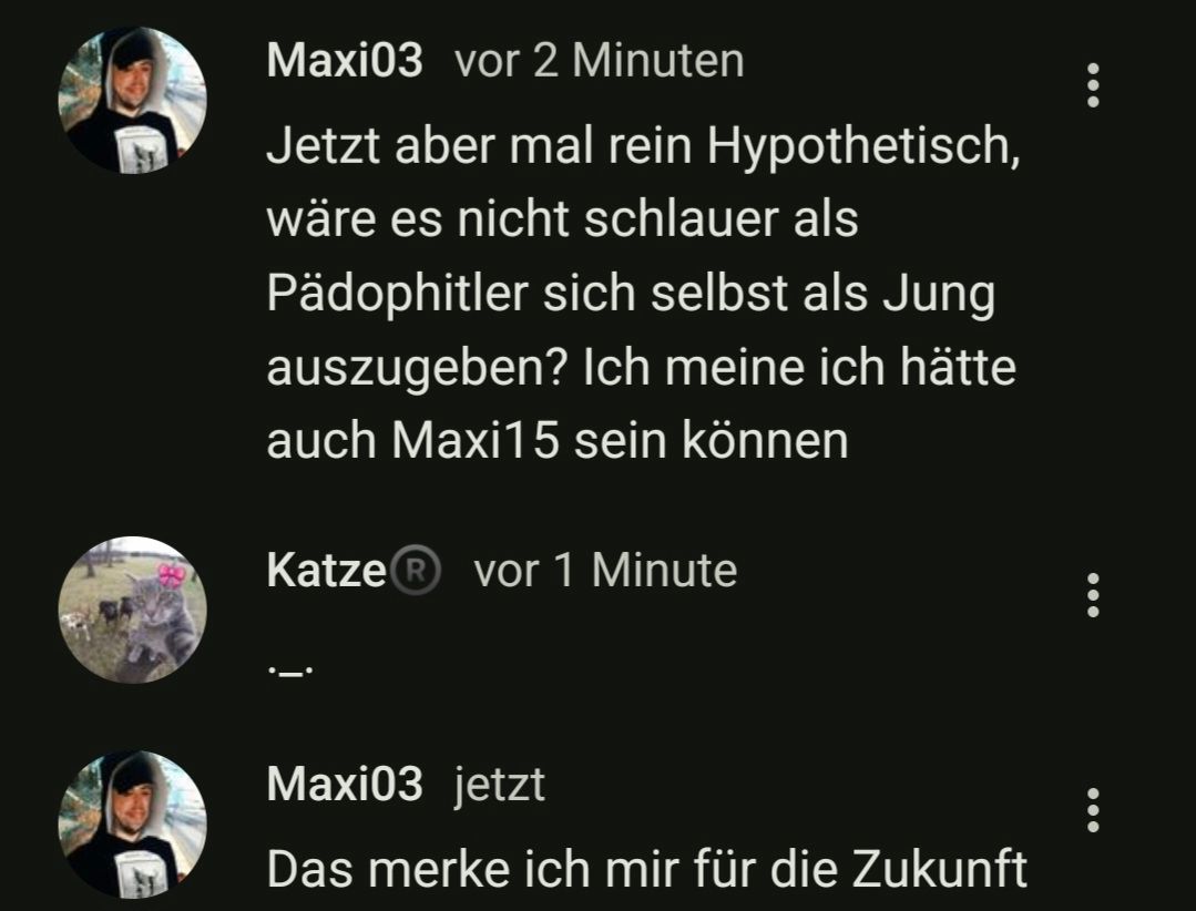 Maxi03vor 18 StundenJetzt aber mal rein Hypothetisch, wäre es nicht schlauer als Pädophitler sich selbst als Jung auszugeben? Ich meine ich hätte auch Maxi15 sein können