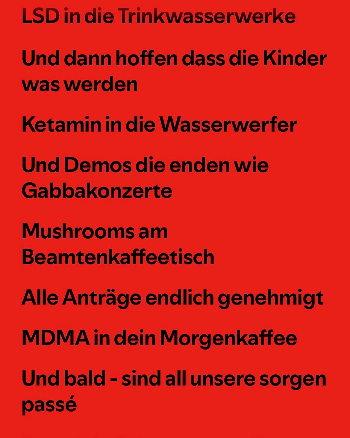 Wir haben keine andere Wahl als zu arbeiten. In dieser Welt ist Geld überlebensnotwendig. Einfach vor sich hin leben ist nicht. Und an Geld kommt man nur, indem man jeden Tag malochen geht. Noch quelle ich beinahe über vor jugendlichem Übermut, aber in ein paar Jahren schon wird die Wut im Bauch einer stillen Resignation weichen, und was ich heute ändern will, nehme ich morgen bloß noch hin. Der Prozess findet schleichend statt, nicht plötzlich, sodass es auch keinen Punkt gibt, an dem man sagt: So, das war's, ich begeh Selbstmord, nein, man rutscht immer tiefer in die Abgründe, in die Fesseln des Systems und redet es sich schön, wenn sie an den Gelenken das Blut abschnüren und die Knochen schmerzen lassen. Und stirbt als mittelloser Rentner in einem überteuerten Altersheim, nachdem man seine letzten Jahre damit verbracht hat, zu versuchen sich nicht vollzupinkeln und dennoch gescheitert ist.