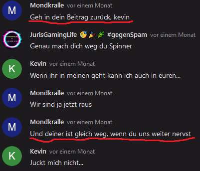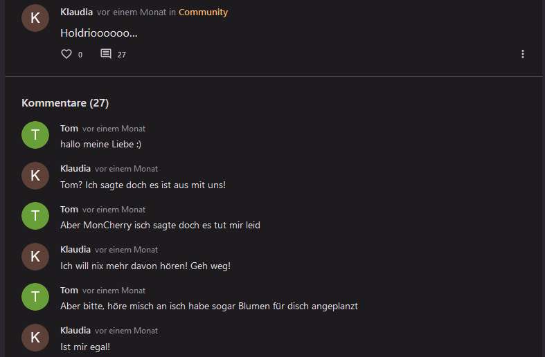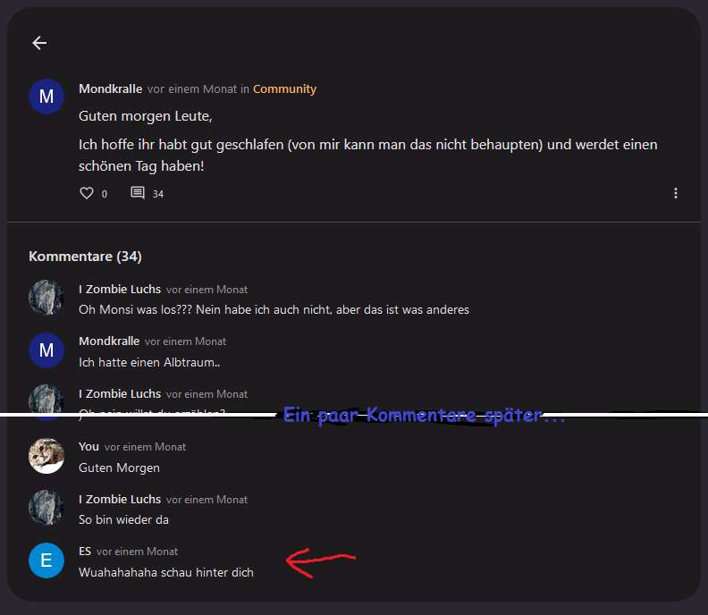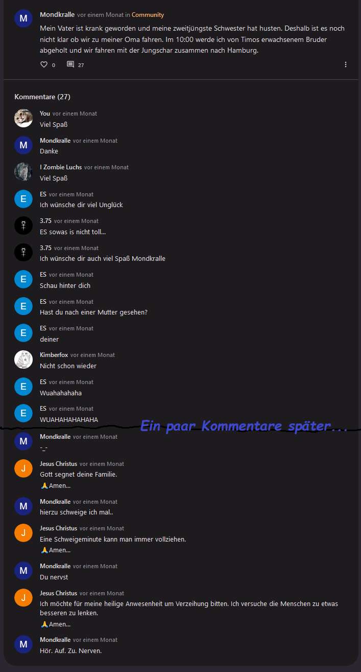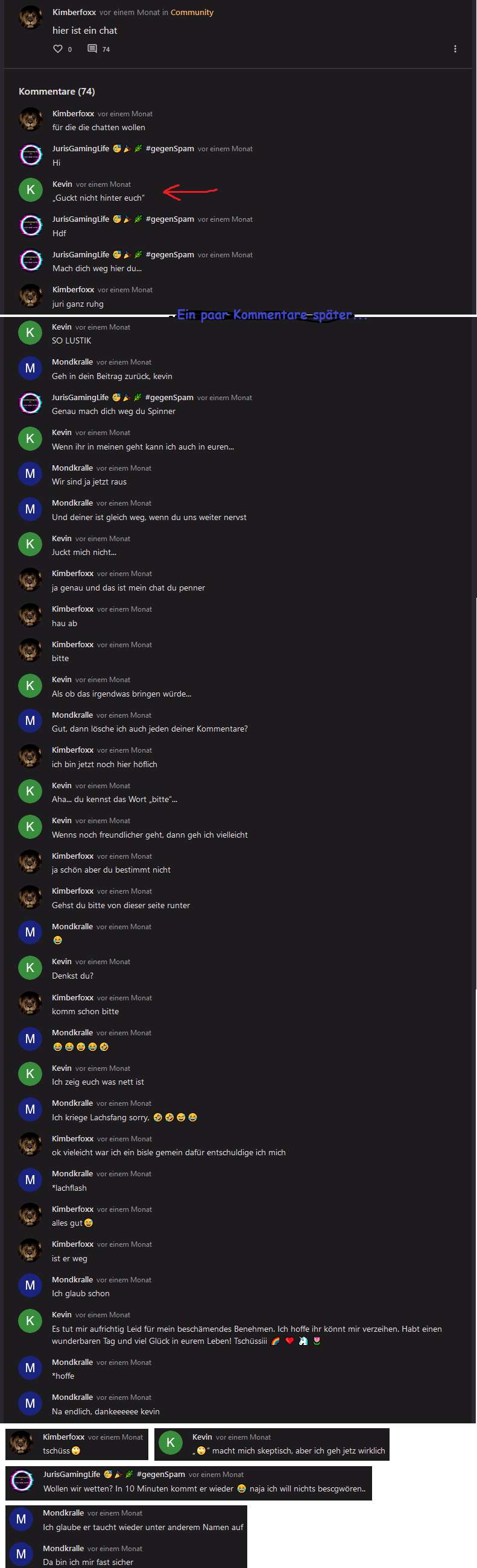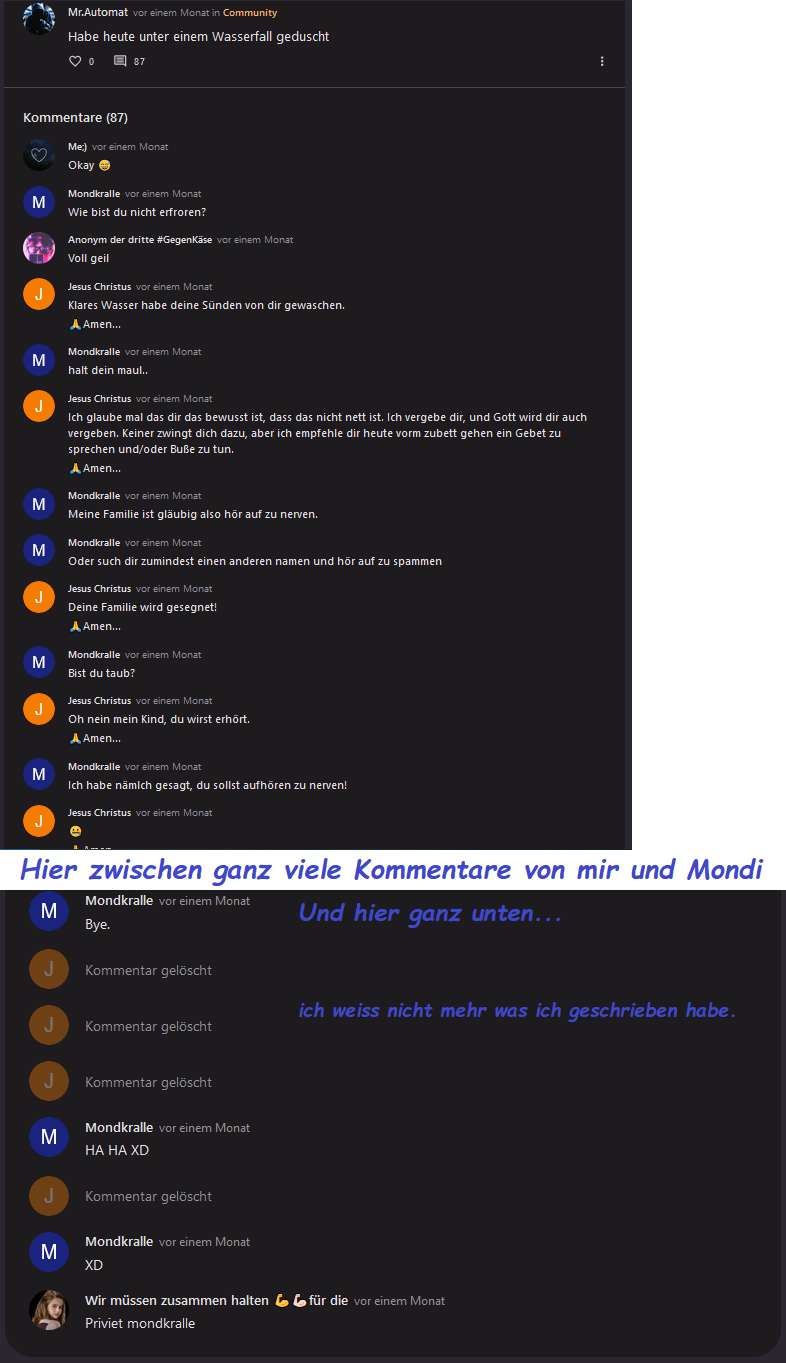 Mondi redet hier davon, meinen Beitrag zu löschen. Ich glaube das hat sie auch getan. Ich erinner mich noch an was, was wohl in dem gelöschten Beitrag stand. Mondi schrieb "Die faker hauen eh nach paar Minuten/am nächsten Tag wieder ab und kommen nie wieder" und ich als Kevin schrieb darauf "Challange accepted", weil ich ihr zeigen wollte das sie bei mir falsch liegt... ja und jetzt bin ich immer noch da.