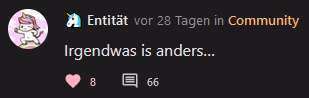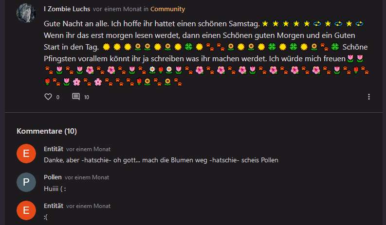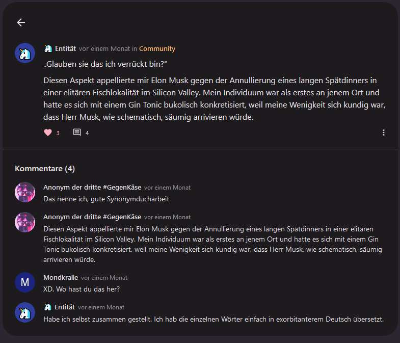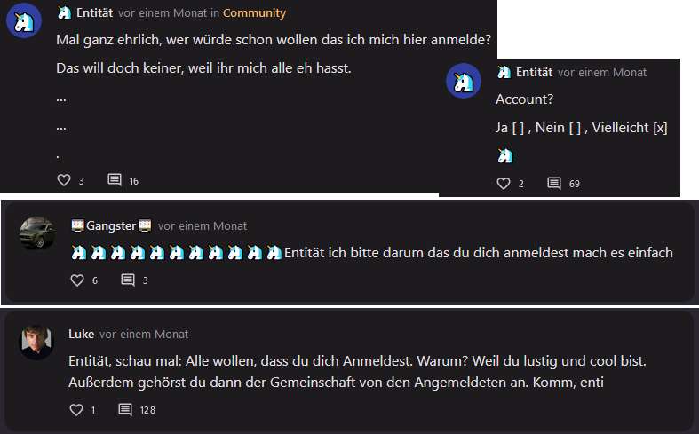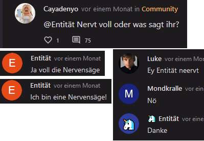 Weil mir die Kommentare gelöscht wurden und ich mich wunderte warum die anderen löschen können entstand dieser Beitrag, den wir über mehrere Tage/Wochen auf 1000 Kommentare brachten. Dort hab ich mich mehrmals umbenannt und auch das erste mal als Entität.