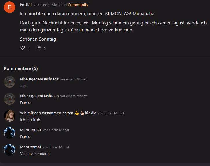 Entitäts erster Beitrag. Am Montag wollte ich alle mal in Ruhe lassen.