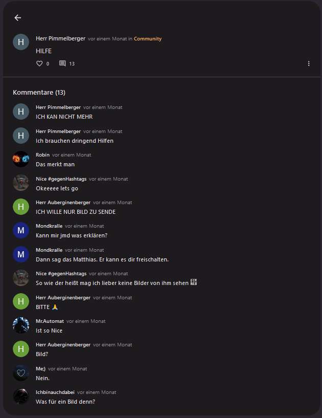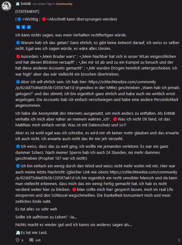 Das war ich, aber als unangemeldet, den ich habe daraufhin einen Account als Herr Pimmelberger ( schlechtewitze.com/@herrpimmelberger ) gemacht, um Bilder zu Posten, aber nicht als Entität. Ich wollte sowas wie das Profilbild posten, weil ichs lustig fand.