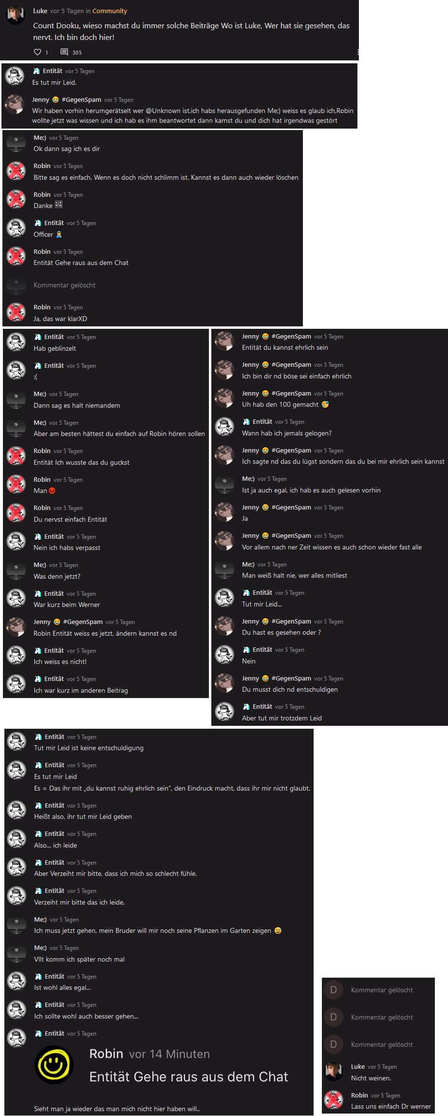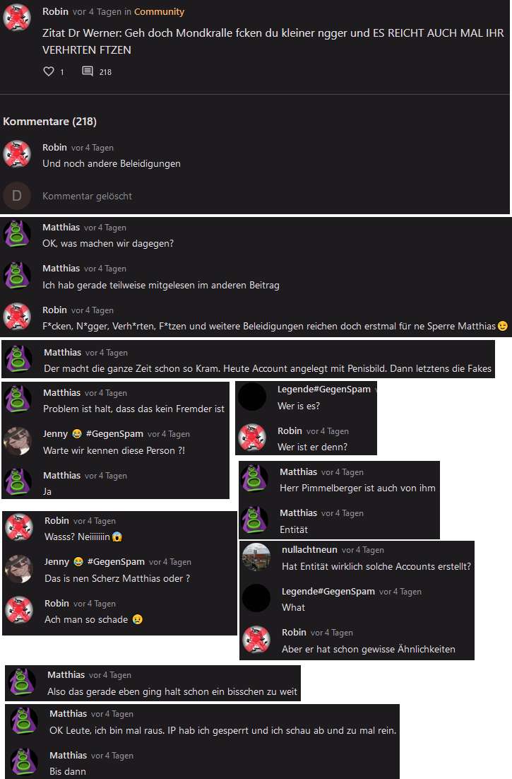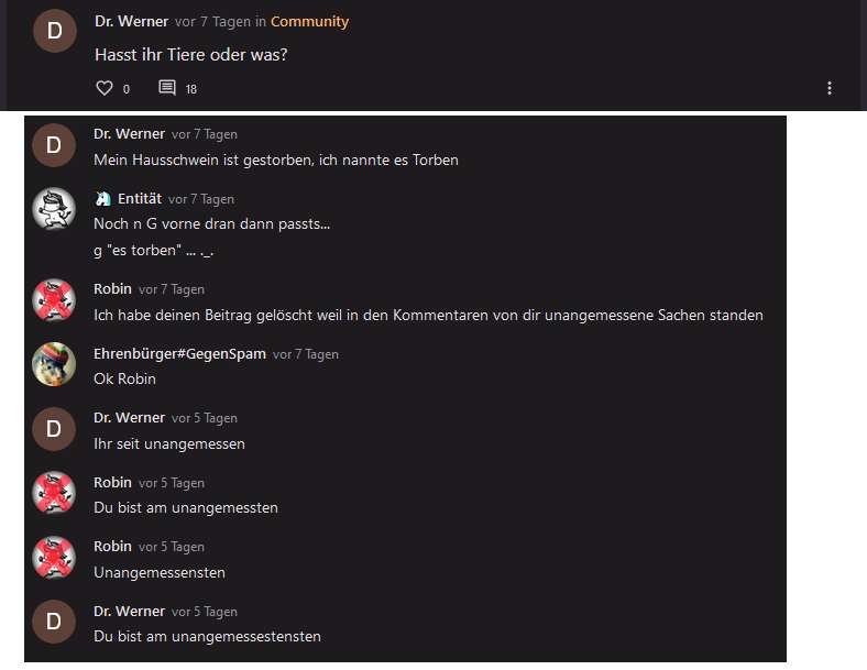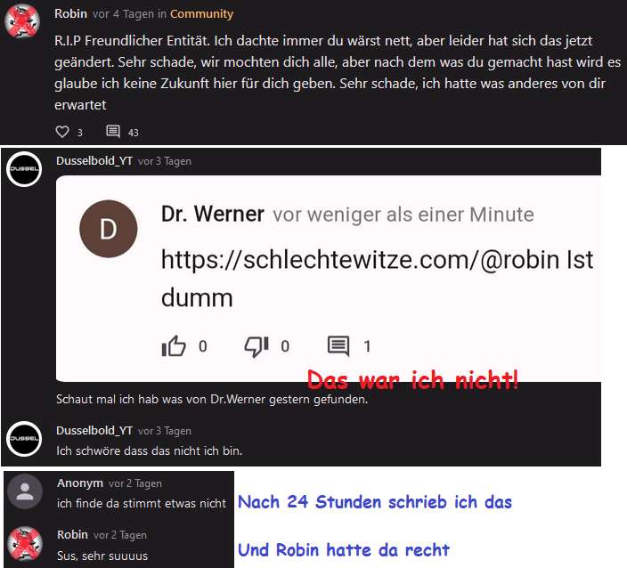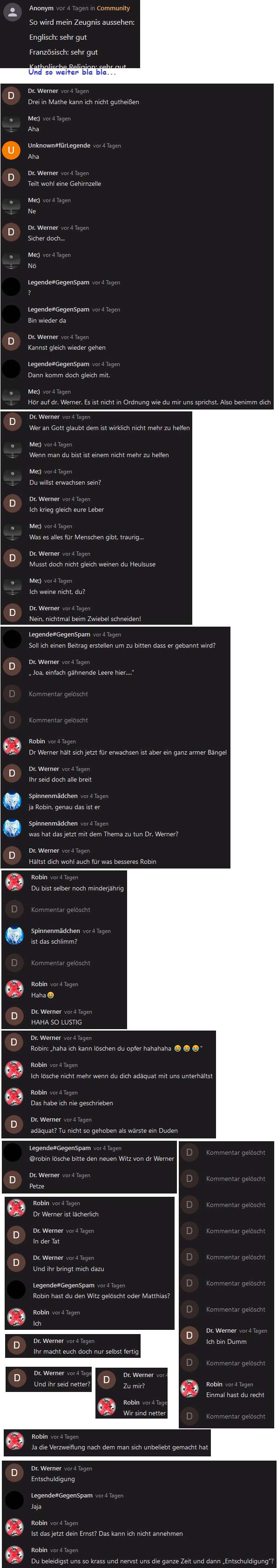 Und hier ging alles den Bach runter. Die Hälfte des Beitrags besteht aus gelöschten Kommentaren. Ich habe als Dr. Werner beleidigt und gespammt, weil Robin alles löschte.