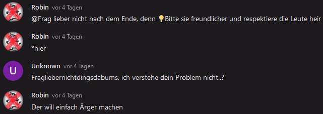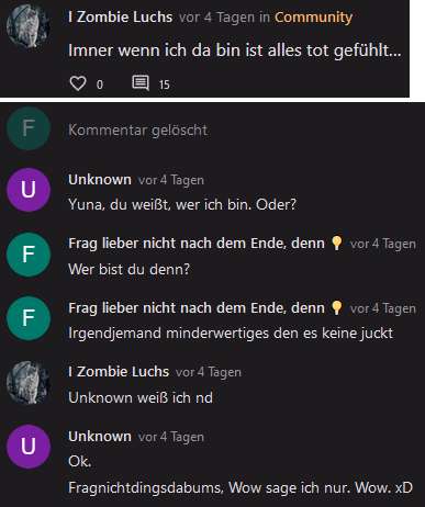 Es wusste aber noch keiner das ich Werner war. Hier hat "Me:)" gesagt wer "Unknown" ist. Robin dachte ich hätte mitgelesen, aber zum Zeitpunkt war ich als Werner im anderen Beitrag beschäftigt und schrieb deshalb "Hab geblinzelt", weil das in weniger als 1 Minute gelöscht wurde und ich es somit nicht gesehen habe. Das mir keiner glaubte hat mich ein wenig niedergeschlagen.