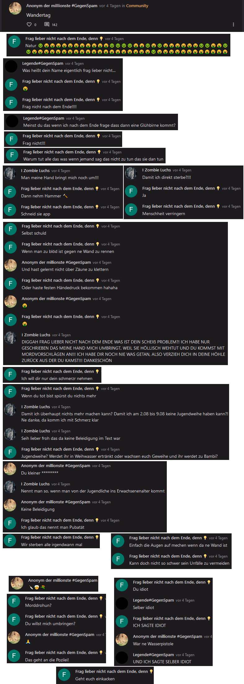 Hier fing es mit Dr. Werner an. Ich hatte glaube 2 Beiträge gemacht in dem stand "Juhuu mein Hausschwein ist gestorben", die wurden aber gelöscht.