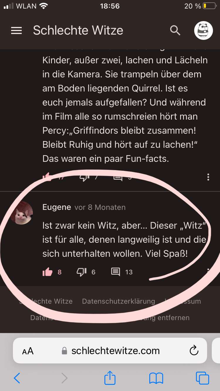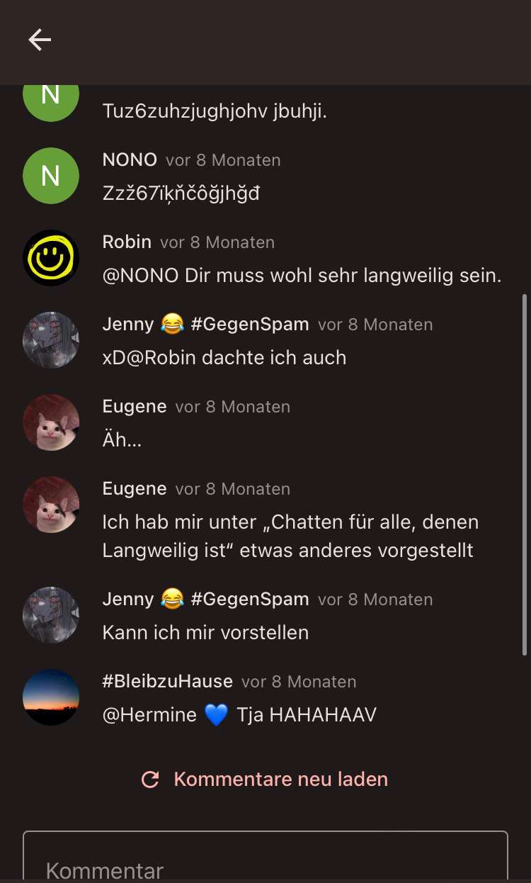Eig wollte ich nur witze lesen. Damals waren dann ja aber auch die „chats“ bei den witzen. Also hab ich die mir mal angeguckt. Iwie hab ich dann mal so ein paar mitgelesen. In der zeit hab ich aber weder kommentiert, noch likes/dislikes vergeben. Iwann bin ich dann nicht mehr auf dieseite gekommen. Nach KA, ein bissl weniger als einem jahr, hab ich mir gedacht : „was ist eig aus der seite geworden? Chatten lina,klausdiemaus, funkeyb,… immer noch?“