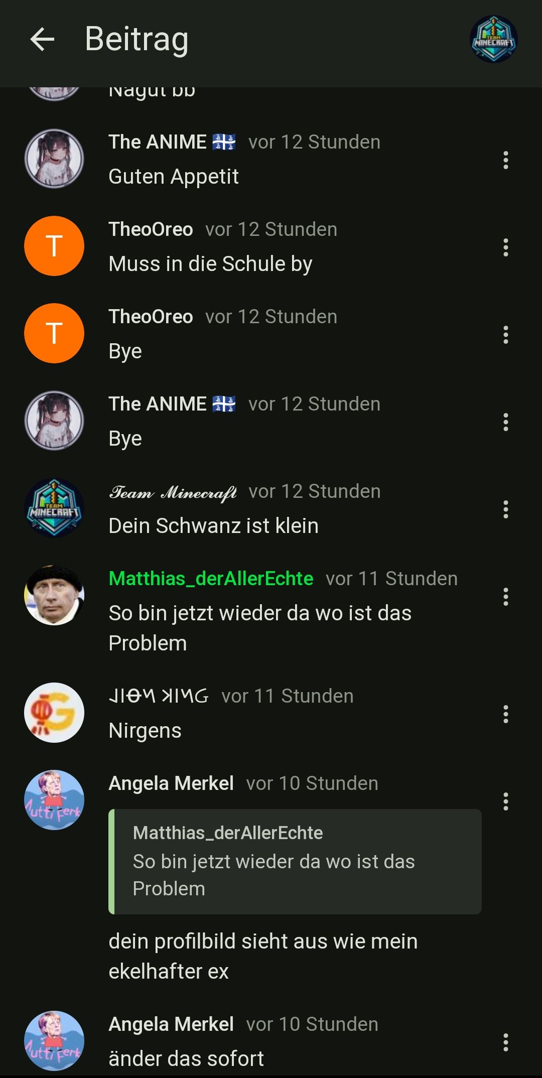 (Entschuldigung für Nummer 2.) Leute, es tut mir leid wegen dem Kommentar von "mir", der in diesen Beitrag gepostet wurde https://schlechtewitze.com/community/p/65d6ef740b34a810ebe60313. Das war nicht ich sondern mein Freund, der mir heute mein schullaptop weggenommen hat. Und da war halt SW offen und er sah halt diesen Beitrag von dem User "deinschwanz" und fand das hier halt ultra komisch:
