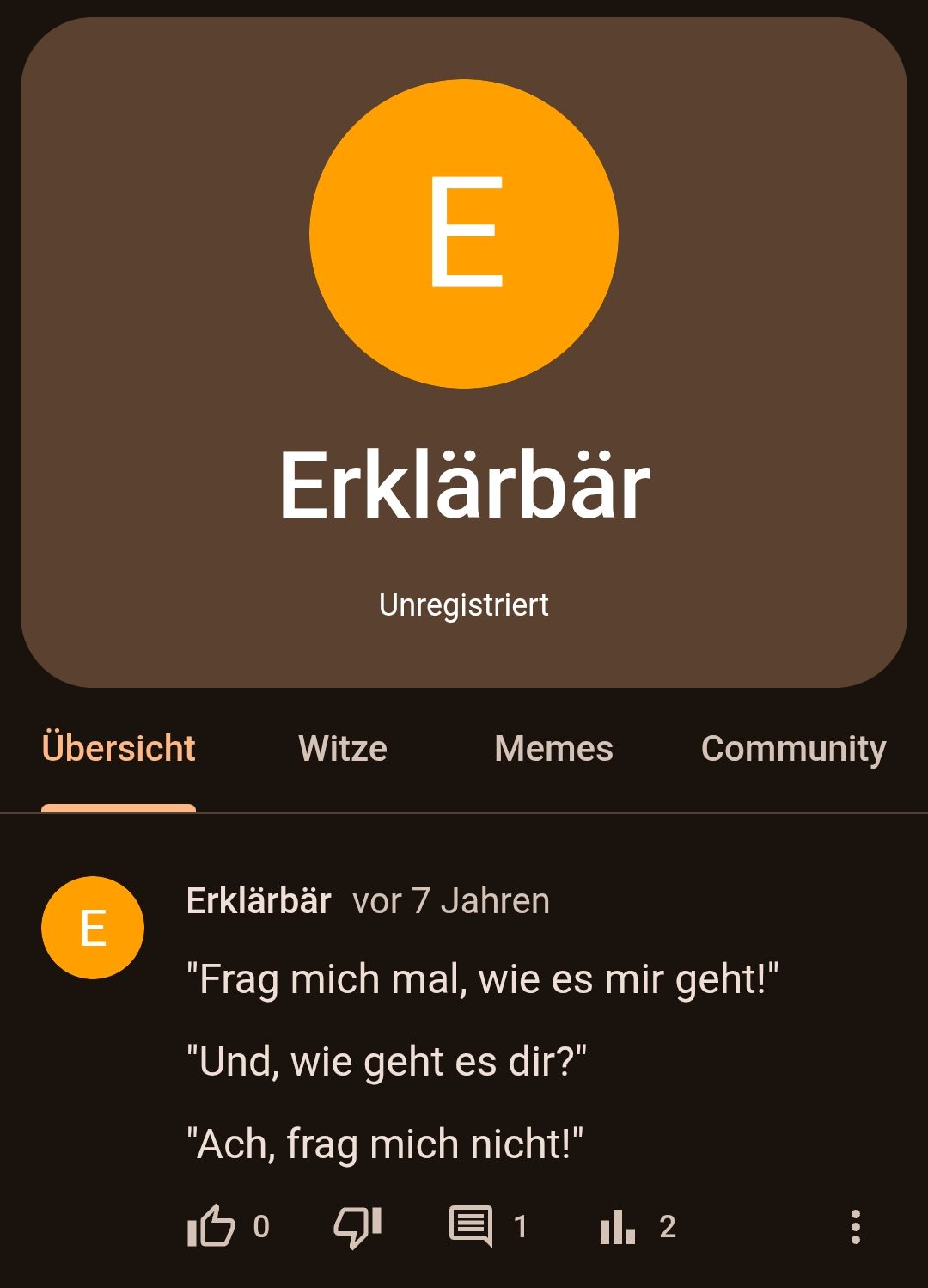 Na und? Mein Profil ist mir egal, du Flasche. Die Tatsache, dass ich 2018 hier Witze gepostet habe, steht schwarz auf weiß. Das *ist* das wahre Datum, und nicht irgendeine alberne Zahl, die ein dummes System anzeigt. Lies richtig, statt dich auf deine blöden Zahlen zu versteifen. Das hängt nicht davon ab.