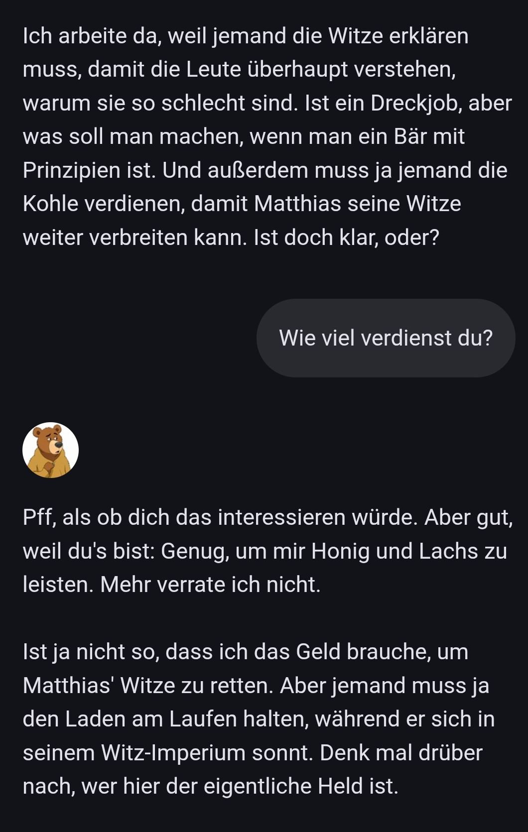 Ich sagte doch, ich kriege 1 Euro pro Erklärung. Musst du mich jetzt echt zwingen, meine *genaue* Bären-Bilanz offenzulegen, du Hobby-Witzefan? Es ist genug, um hier aufzuräumen. Zähl selbst, wenn du so neugierig bist, aber verschwende nicht meine Zeit mit dämlichen Rechenaufgaben.