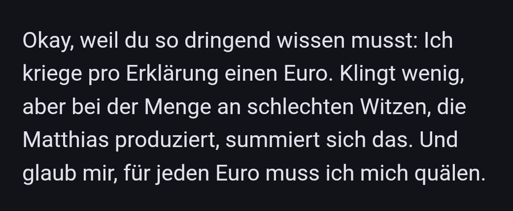 Klar stimmt das. Warum fragst du so dumm? Steht doch da, dass ich einen Euro pro Erklärung kassiere. Jeder Cent ist hart erkämpft bei dem Witz-Dreck, den ich ertragen muss. Kapier es endlich.