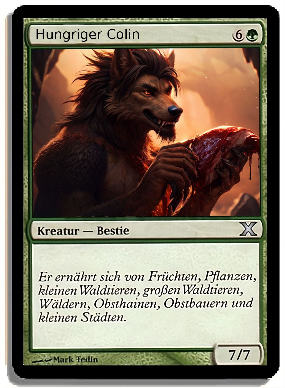 Ich wurde mal folgendermaßen vorgestellt: "Ist Colin auch Vegetarier?" - "Nein. Der isst alles." Und was soll ich sagen... das stimmt ^^ Damit hab ich Jana schon mehrfach zur Verzweiflung gebracht