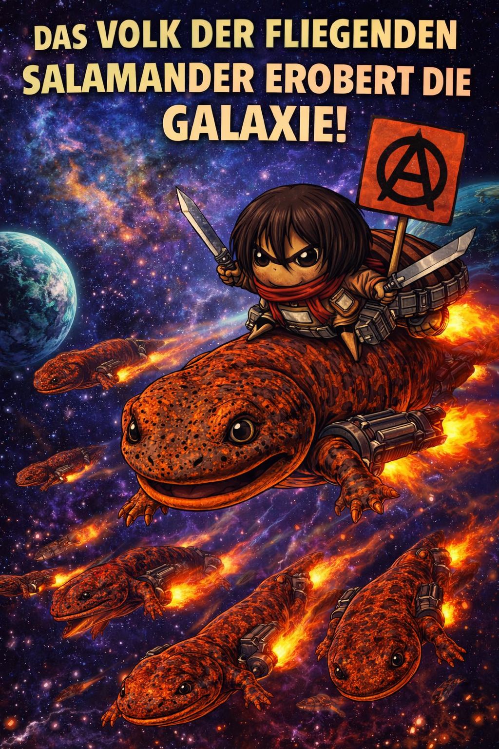 Lasst uns DIE WELTHERRSCHAFT AN UNS REISSEN und dann MIT JAPANISCHEN RIESENSALAMANDERN durchs ALL FLIEGEN und somit DIE HERRSCHAFT ÜBER DIE GALAXIE zu erringen, und dann werden wir bekannt als das VOLK DER FLIEGENDEN SALAMANDERN