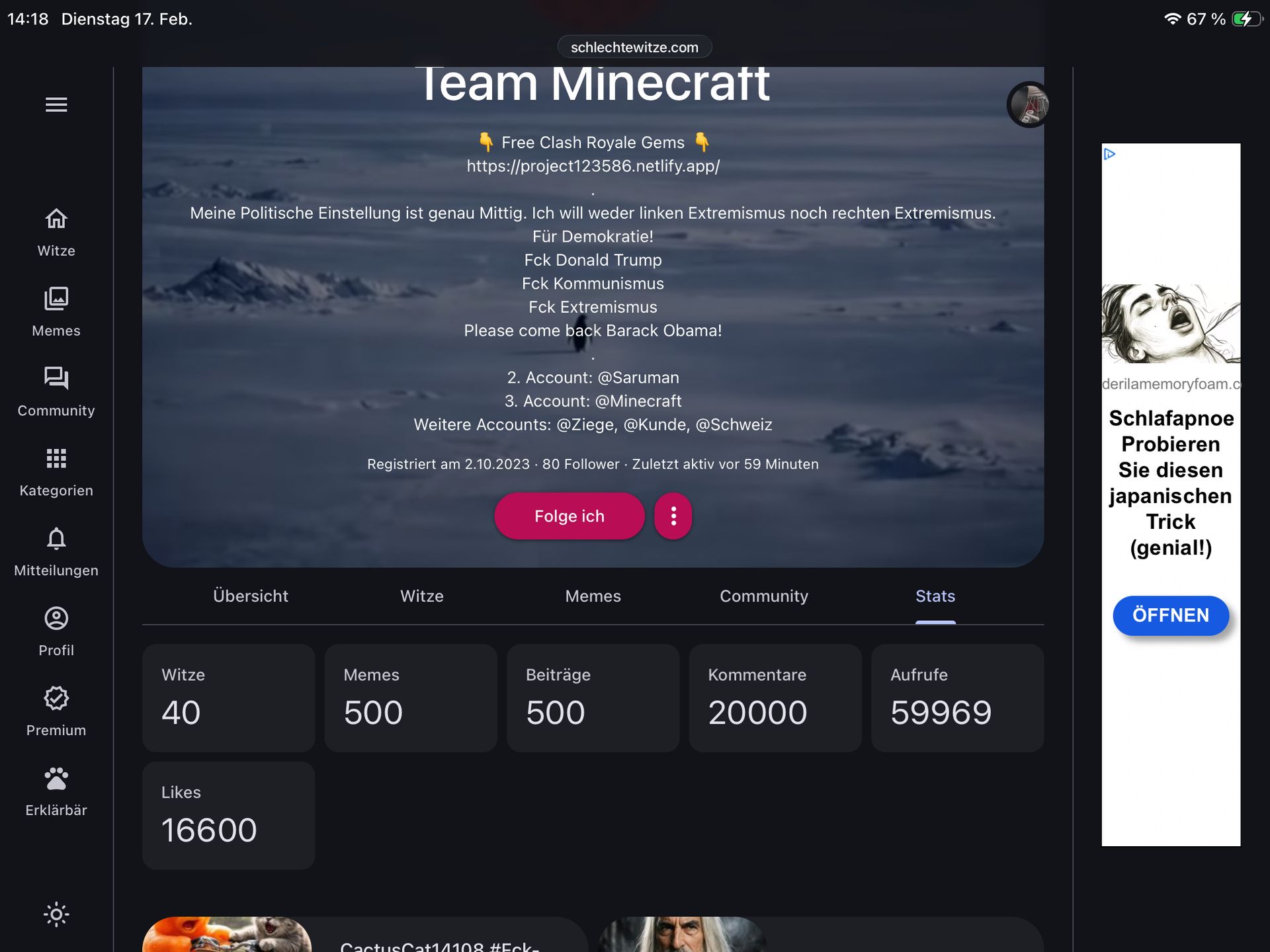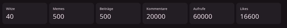 Leute, mit diesem Beitrag ist mein Stat Ziel auf diesem acc erfüllt. 40 Witze, 500 Memes, 500 Beiträge, 20000 Kommentare, und noch 30 aufrufe und 1 like, (oder 20) und ich hätte alle stats voll.