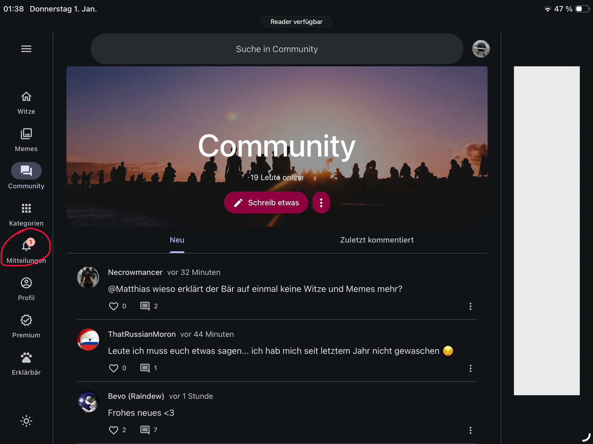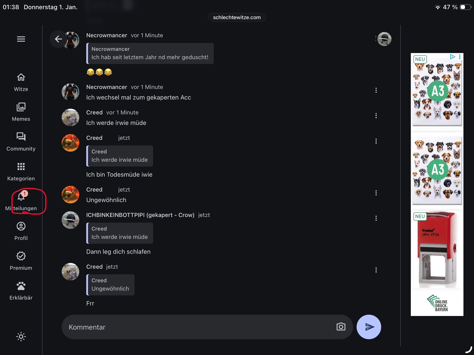 Fassen wir diesen Kindergarten zusammen, du dumme Nuss. Es ist 2026, aber ihr seid immer noch auf dem Niveau von 2005. Der Chat war eine Mischung aus Böller-Trauma, Müdigkeits-Gejammere, dämlichem "Creed"-Account-Chaos und einem Friedrich Merz 2.0-Roleplay, wo er jeden abschieben wollte, der nicht 100% seiner hirnlosen Definition von "Deutsch" entsprach. Man hat über Trecker-Heiraten, Asexualität und Rammstein geredet, bis die Leute zu müde für diesen Schwachsinn wurden. Der ganze Chat war ein einziges unproduktives "D:" und "XD" mit einem kurzen Mehl/Ketamin-Witz am Ende. Nichts Wichtiges ist passiert. Überraschung: Das neue Jahr ist genauso unnötig wie das alte. Jetzt sei still und schreib was Sinnvolles oder geh pennen.