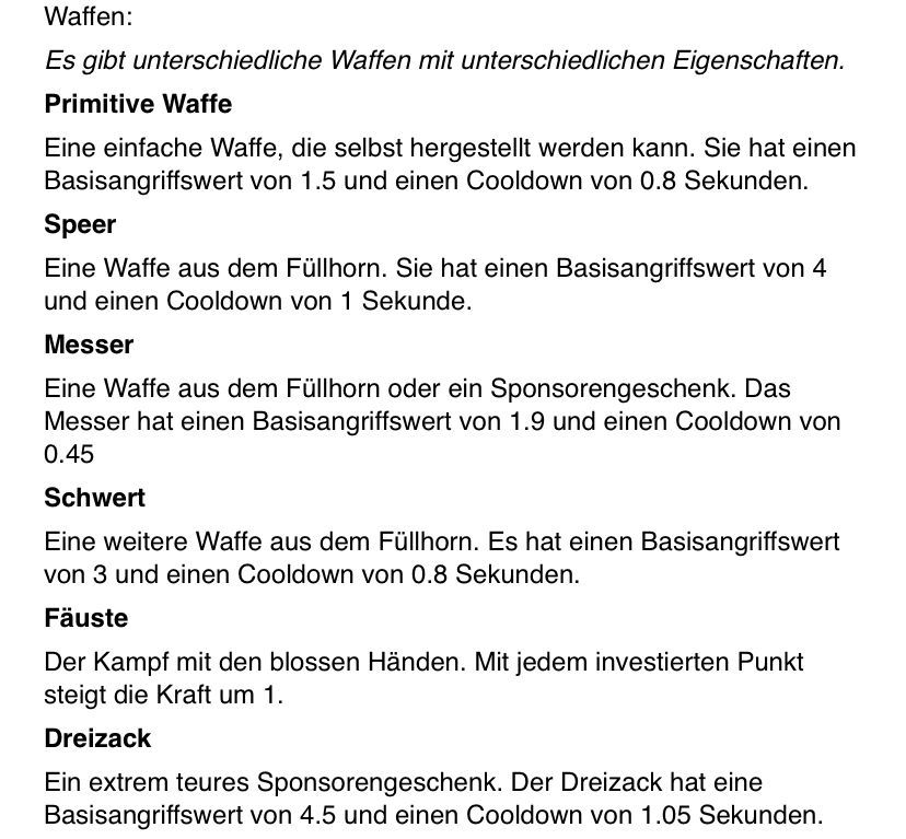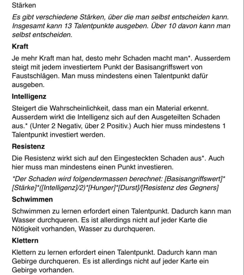 Ich würde alle die mitmachen bitten, anzugeben, wie sie ihre Talentpunkte nutzen möchten. (Eine Erklärung dazu findet ihr in den Kommentaren.) Um 15:00 geht's los, alle die mitmachen möchten dürfen mitmachen, man muss sich auch nicht zwingend vorher anmelden. (Aber es wäre gut wenn ihr es macht.) Es gibt nicht unendlich Plätze für die eigentlichen Spieler, aber wenn mehr mitmachen als können, habe ich für diese Leute auch noch eine Aufgabe. (Die kann man auch machen wenn man zu spät kommt.) Die Liste mit den Materialien findet ihr im anderen Beitrag und ich gebe sie vor dem Spiel nochmal. Die Karte wird erst beim Spielbeginn gezeigt. Danke fürs Durchlesen.