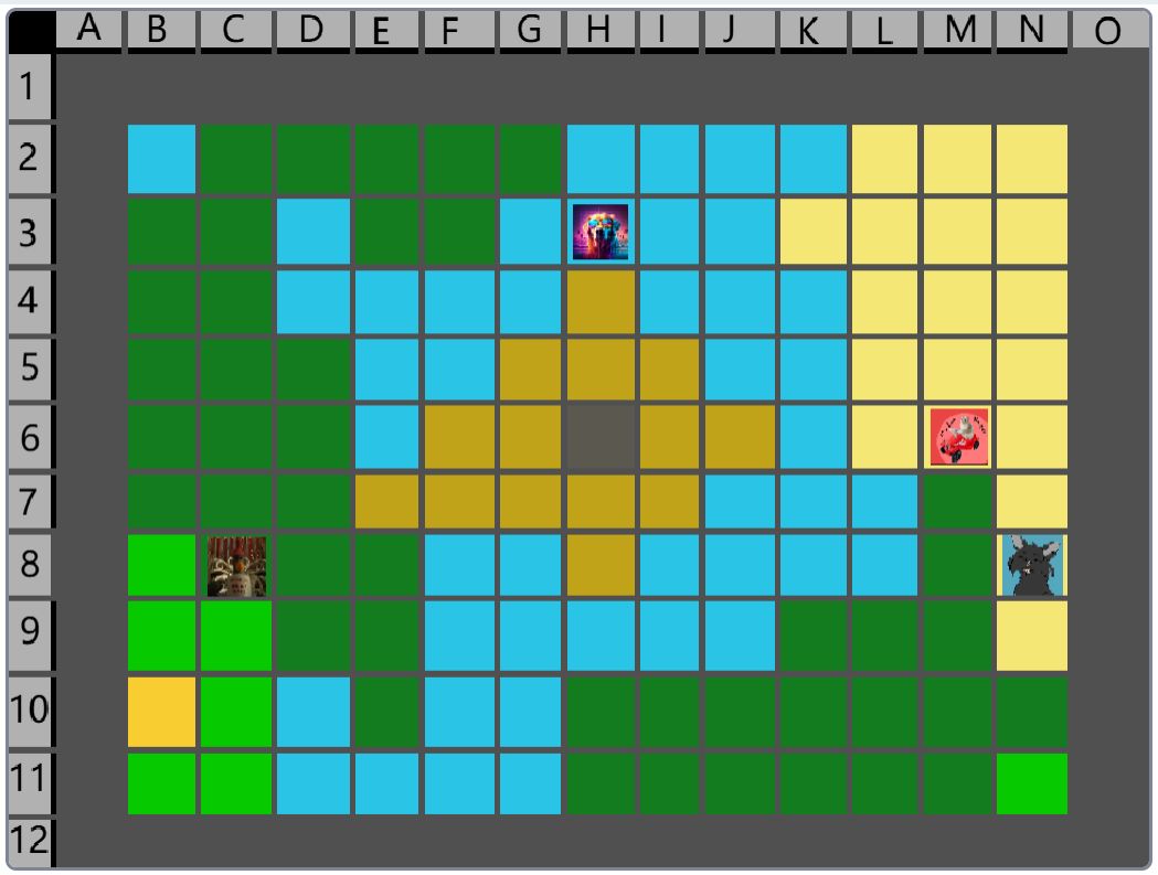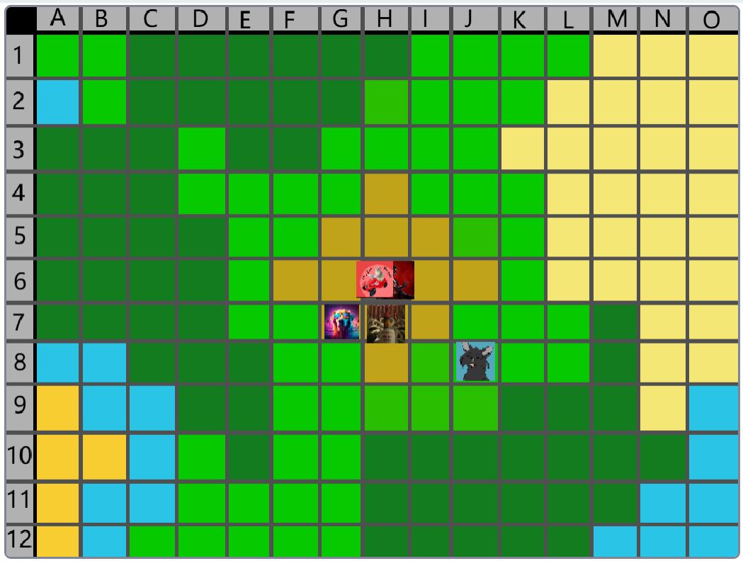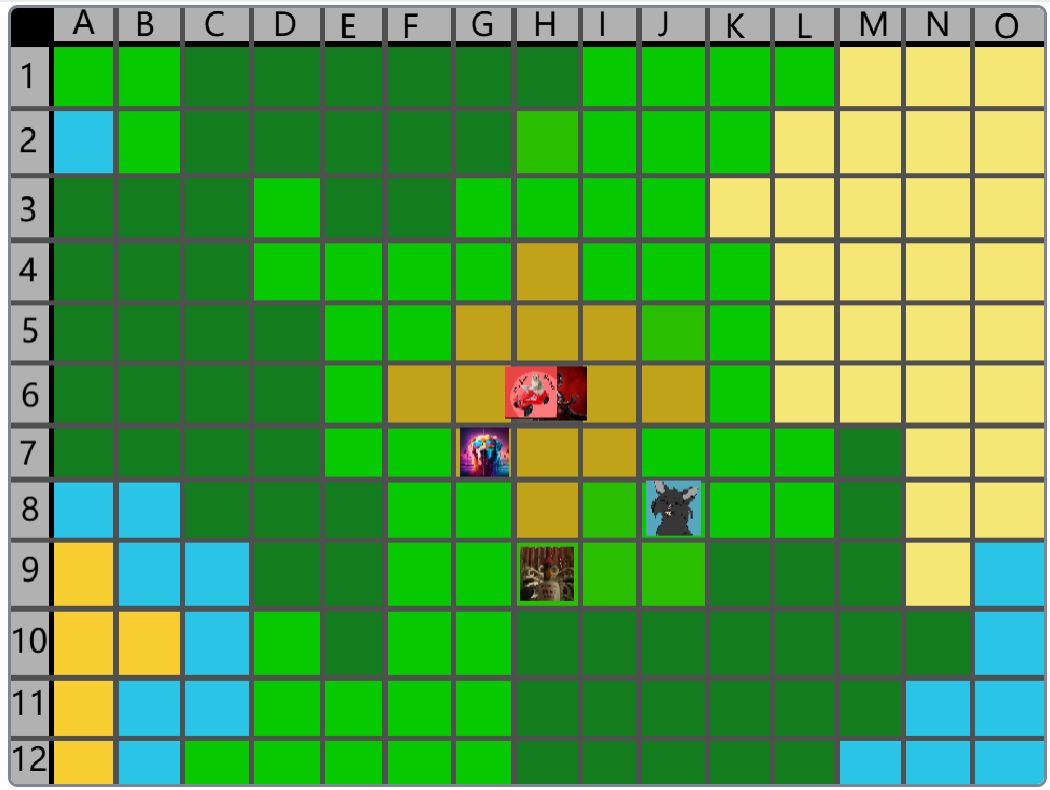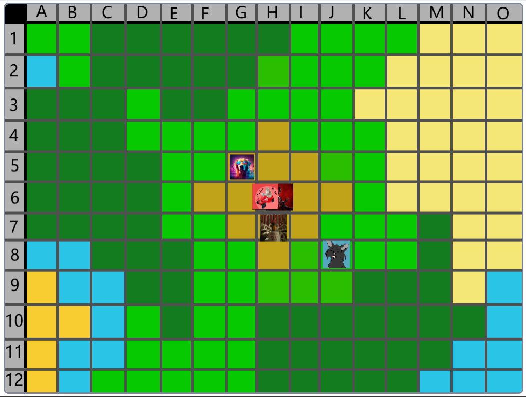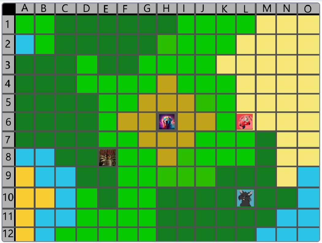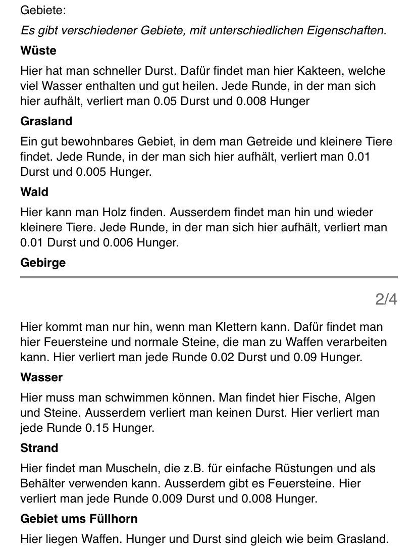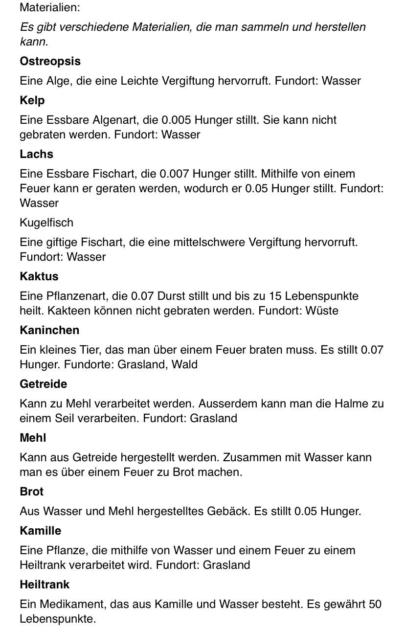 Hier wäre der Beitrag für das Event nachher. (15:00) Der Spielablauf wäre folgendermassen: Das Spiel ist Rundenbasiert, das heisst die Spieler spielen abwechselnd. Der Anfang läuft besonders ab, denn das ist die einzige Situation, in der die Spieler nicht kämpfen müssen. Wenn die Spieler auf das Füllhorn zu gehen, können sie mir vorher sagen, ob sie kämpfen oder nicht. Nur wenn alle Spieler, die im Kampf beteiligt wären, kämpfen wollen, findet der Kampf statt. Ansonsten ist alles völlig normal. Schritt 1: Als erstes darf sich jeder Spieler um bis zu 2 Felder bewegen. (Vertikal oder horizontal) Je nach Gebiet, auf dem sie landen, können sie unterschiedliche Materialien finden. Ausserdem werden Hunger und Durst geändert. Falls die Spieler sich in eine Falle der Spielmacher begeben, wird ausserdem die entsprechende Reaktion ausgelöst. (Schaden, Vergiftung, etc.). Falls auf diesem Feld schon ein anderer Spieler ist, gibt es einen Kampf, ausser, beide wollen ein Bündnis. (Es ist VERBOTEN, Bündnisse abzusprechen, wenn man nicht auf demselben Feld ist. Ausserdem darf man keine Privatnachrichten verwenden. Sollte man es trotzdem tun und ich finde es heraus, bekommen die entsprechenden Spieler eine schwere Vergiftung.) Danach endet der erste Teil, und der nächste Spieler darf sich bewegen. Sobald alle Spieler mir mitgeteilt haben, wohin sie sich bewegen, beginnt Schritt 2: Schritt 2: Der Spieler darf jetzt seine Materialien verwenden, um zu essen, zu trinken, dinge herzustellen etc. Es wird kein Hunger/Durst abgezogen oder schaden genommen. Ausserdem erhält der Spieler eine kleine Menge Geld, mit der er sich gewisse Materialien kaufen kann. Das machen auch wieder alle Spieler.