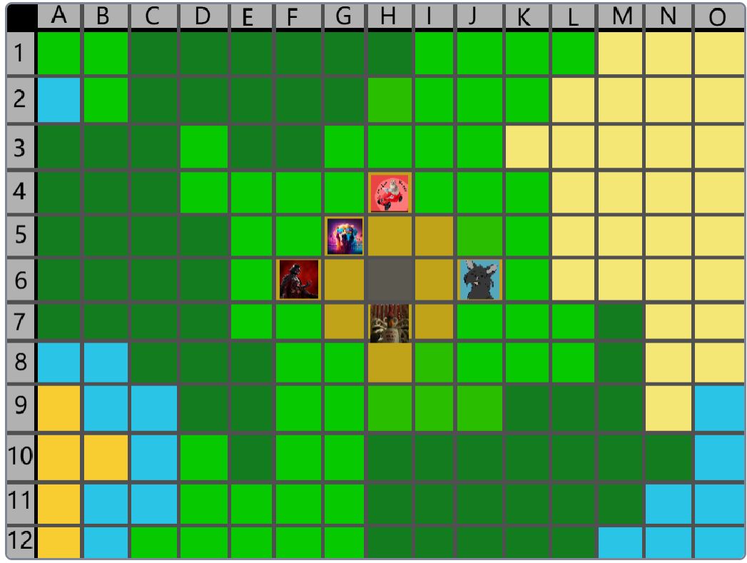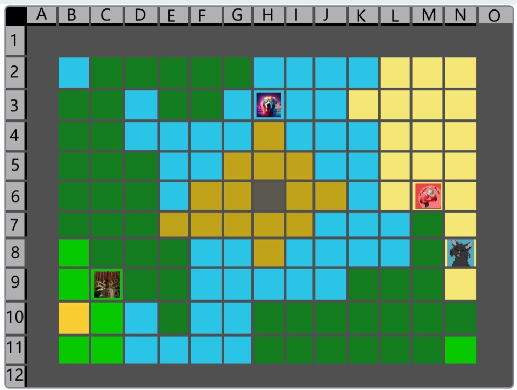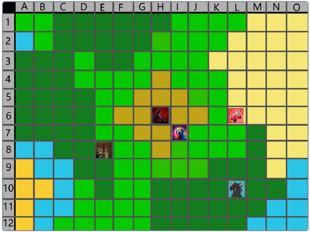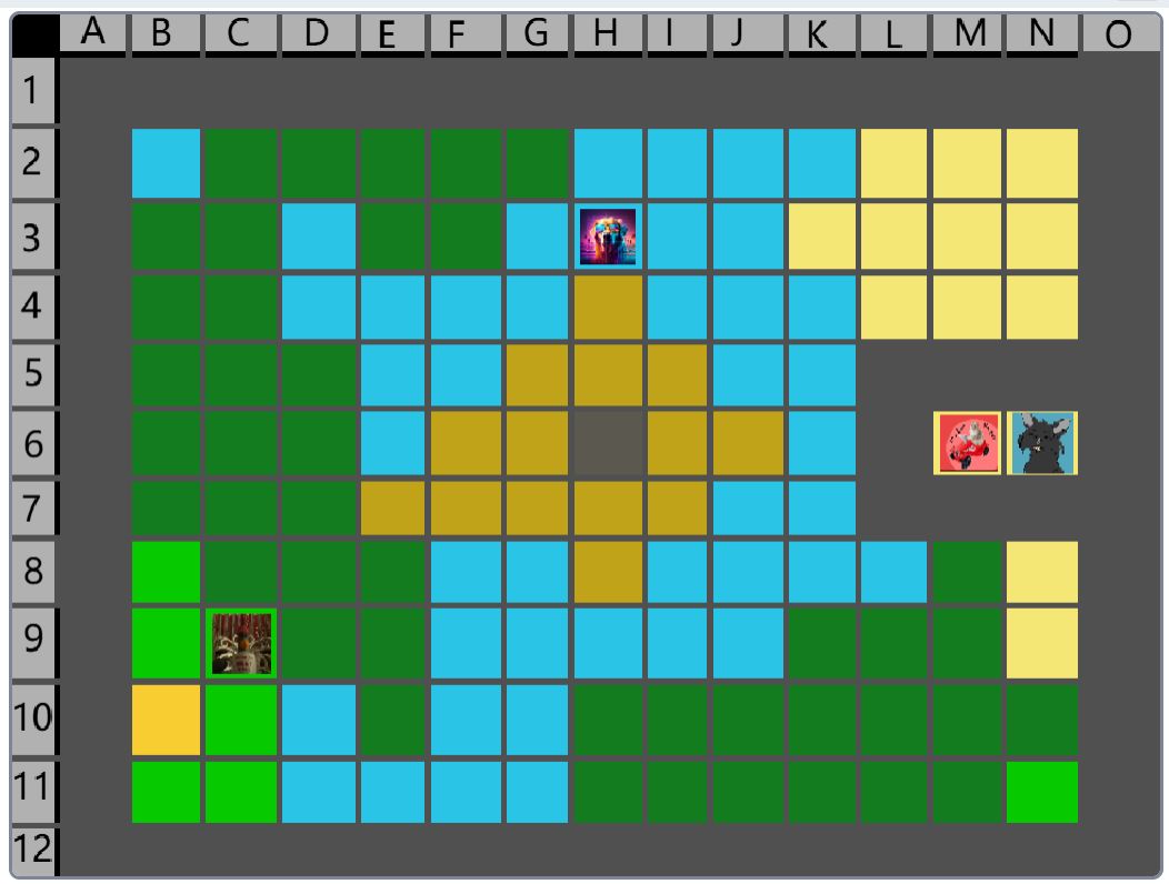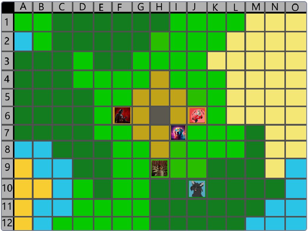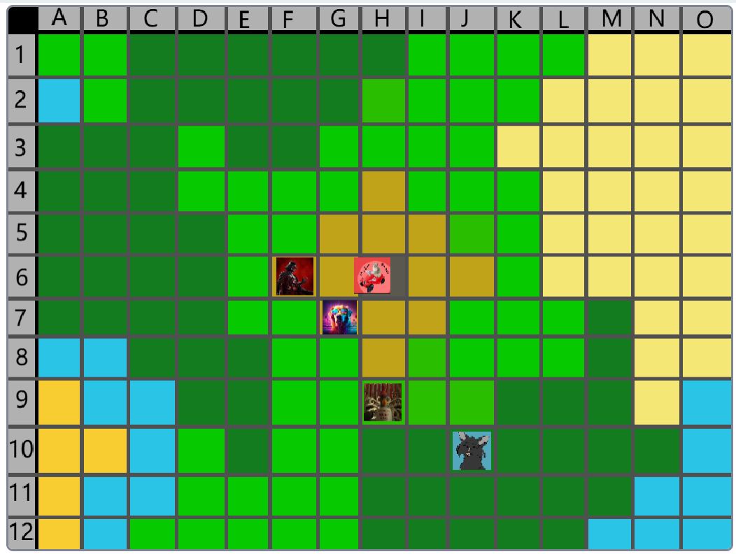 Hier wäre der Beitrag für das Event nachher. (15:00) Der Spielablauf wäre folgendermassen: Das Spiel ist Rundenbasiert, das heisst die Spieler spielen abwechselnd. Der Anfang läuft besonders ab, denn das ist die einzige Situation, in der die Spieler nicht kämpfen müssen. Wenn die Spieler auf das Füllhorn zu gehen, können sie mir vorher sagen, ob sie kämpfen oder nicht. Nur wenn alle Spieler, die im Kampf beteiligt wären, kämpfen wollen, findet der Kampf statt. Ansonsten ist alles völlig normal. Schritt 1: Als erstes darf sich jeder Spieler um bis zu 2 Felder bewegen. (Vertikal oder horizontal) Je nach Gebiet, auf dem sie landen, können sie unterschiedliche Materialien finden. Ausserdem werden Hunger und Durst geändert. Falls die Spieler sich in eine Falle der Spielmacher begeben, wird ausserdem die entsprechende Reaktion ausgelöst. (Schaden, Vergiftung, etc.). Falls auf diesem Feld schon ein anderer Spieler ist, gibt es einen Kampf, ausser, beide wollen ein Bündnis. (Es ist VERBOTEN, Bündnisse abzusprechen, wenn man nicht auf demselben Feld ist. Ausserdem darf man keine Privatnachrichten verwenden. Sollte man es trotzdem tun und ich finde es heraus, bekommen die entsprechenden Spieler eine schwere Vergiftung.) Danach endet der erste Teil, und der nächste Spieler darf sich bewegen. Sobald alle Spieler mir mitgeteilt haben, wohin sie sich bewegen, beginnt Schritt 2: Schritt 2: Der Spieler darf jetzt seine Materialien verwenden, um zu essen, zu trinken, dinge herzustellen etc. Es wird kein Hunger/Durst abgezogen oder schaden genommen. Ausserdem erhält der Spieler eine kleine Menge Geld, mit der er sich gewisse Materialien kaufen kann. Das machen auch wieder alle Spieler.