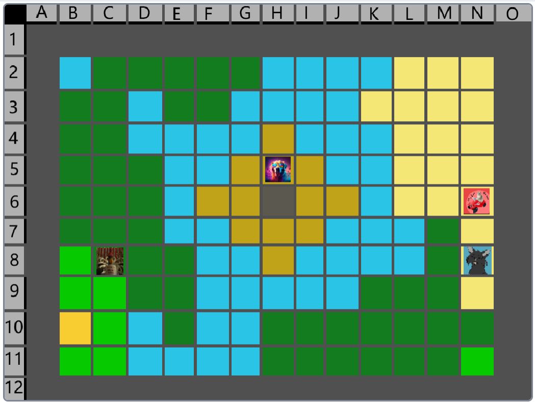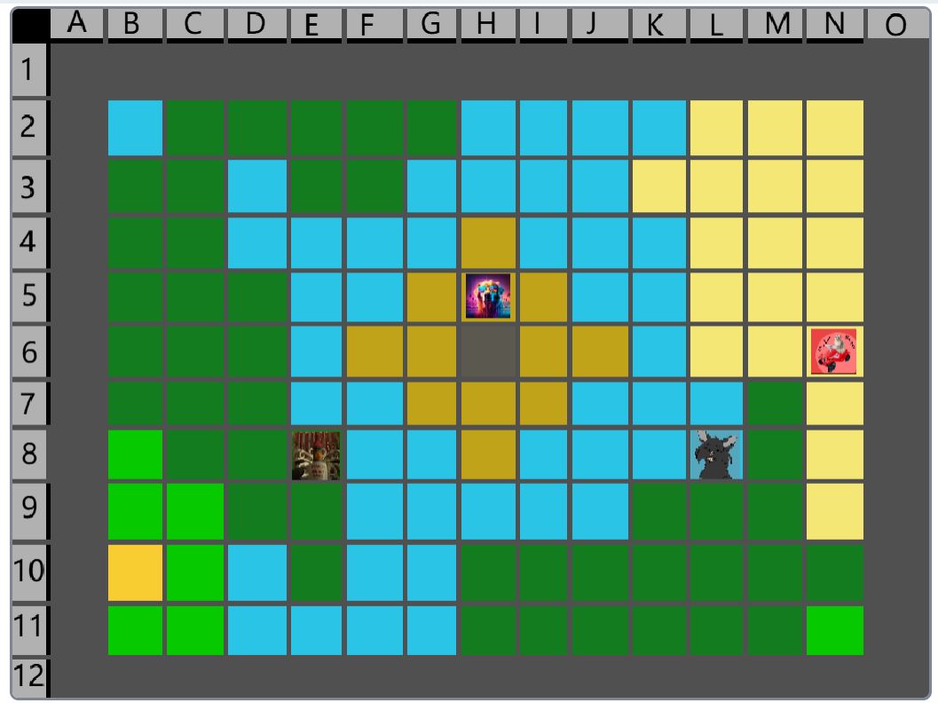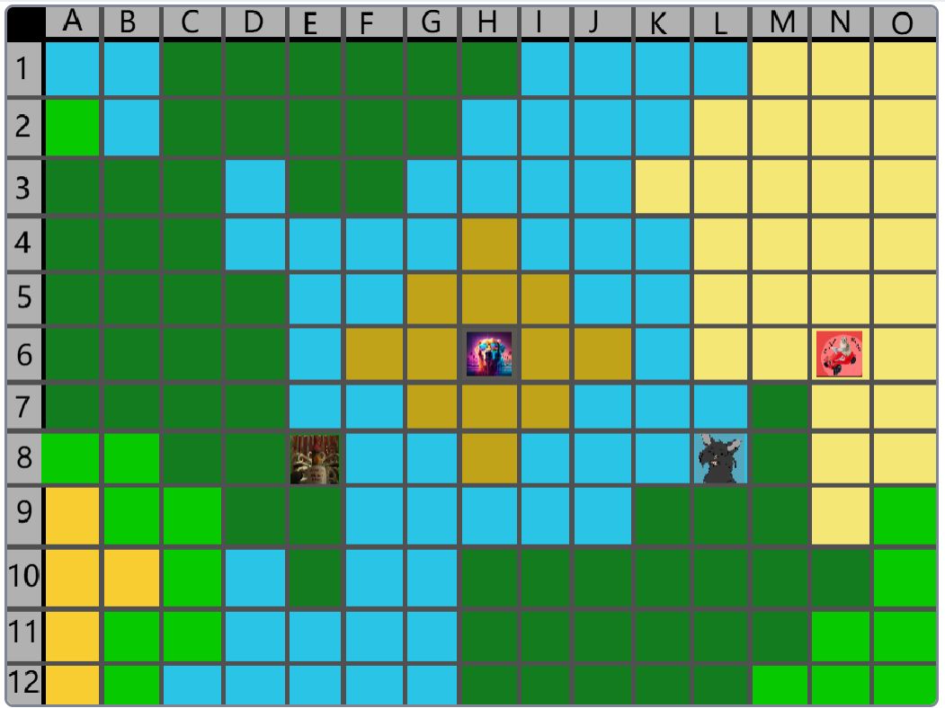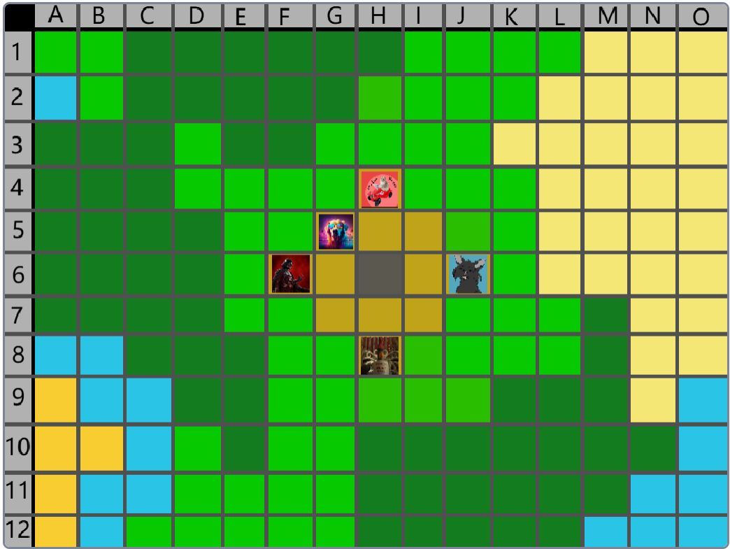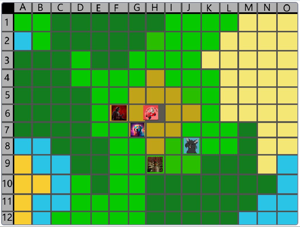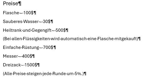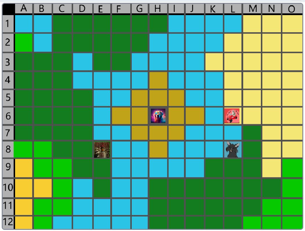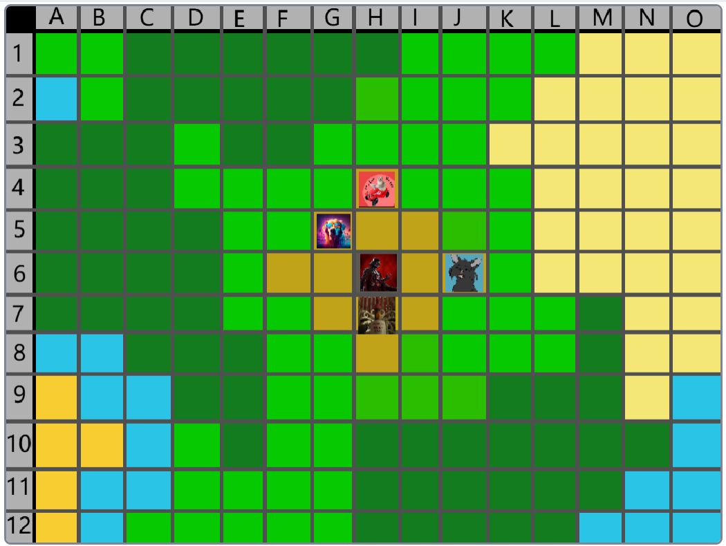 Hier wäre der Beitrag für das Event nachher. (15:00) Der Spielablauf wäre folgendermassen: Das Spiel ist Rundenbasiert, das heisst die Spieler spielen abwechselnd. Der Anfang läuft besonders ab, denn das ist die einzige Situation, in der die Spieler nicht kämpfen müssen. Wenn die Spieler auf das Füllhorn zu gehen, können sie mir vorher sagen, ob sie kämpfen oder nicht. Nur wenn alle Spieler, die im Kampf beteiligt wären, kämpfen wollen, findet der Kampf statt. Ansonsten ist alles völlig normal. Schritt 1: Als erstes darf sich jeder Spieler um bis zu 2 Felder bewegen. (Vertikal oder horizontal) Je nach Gebiet, auf dem sie landen, können sie unterschiedliche Materialien finden. Ausserdem werden Hunger und Durst geändert. Falls die Spieler sich in eine Falle der Spielmacher begeben, wird ausserdem die entsprechende Reaktion ausgelöst. (Schaden, Vergiftung, etc.). Falls auf diesem Feld schon ein anderer Spieler ist, gibt es einen Kampf, ausser, beide wollen ein Bündnis. (Es ist VERBOTEN, Bündnisse abzusprechen, wenn man nicht auf demselben Feld ist. Ausserdem darf man keine Privatnachrichten verwenden. Sollte man es trotzdem tun und ich finde es heraus, bekommen die entsprechenden Spieler eine schwere Vergiftung.) Danach endet der erste Teil, und der nächste Spieler darf sich bewegen. Sobald alle Spieler mir mitgeteilt haben, wohin sie sich bewegen, beginnt Schritt 2: Schritt 2: Der Spieler darf jetzt seine Materialien verwenden, um zu essen, zu trinken, dinge herzustellen etc. Es wird kein Hunger/Durst abgezogen oder schaden genommen. Ausserdem erhält der Spieler eine kleine Menge Geld, mit der er sich gewisse Materialien kaufen kann. Das machen auch wieder alle Spieler.
