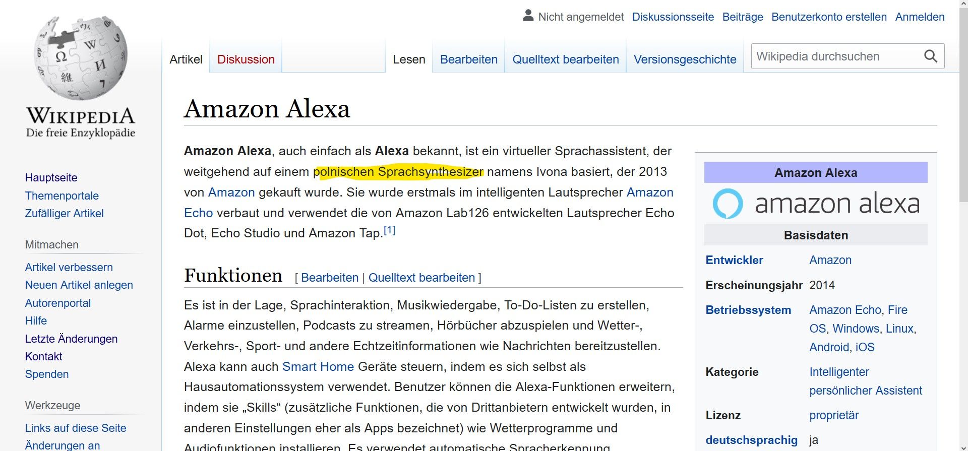 Fakt: Amazon Alexa, auch einfach als Alexa bekannt, ist ein virtueller Sprachassistent, der weitgehend auf einem polnischen Sprachsynthesizer namens Ivona basiert, der 2013 von Amazon gekauft wurde
