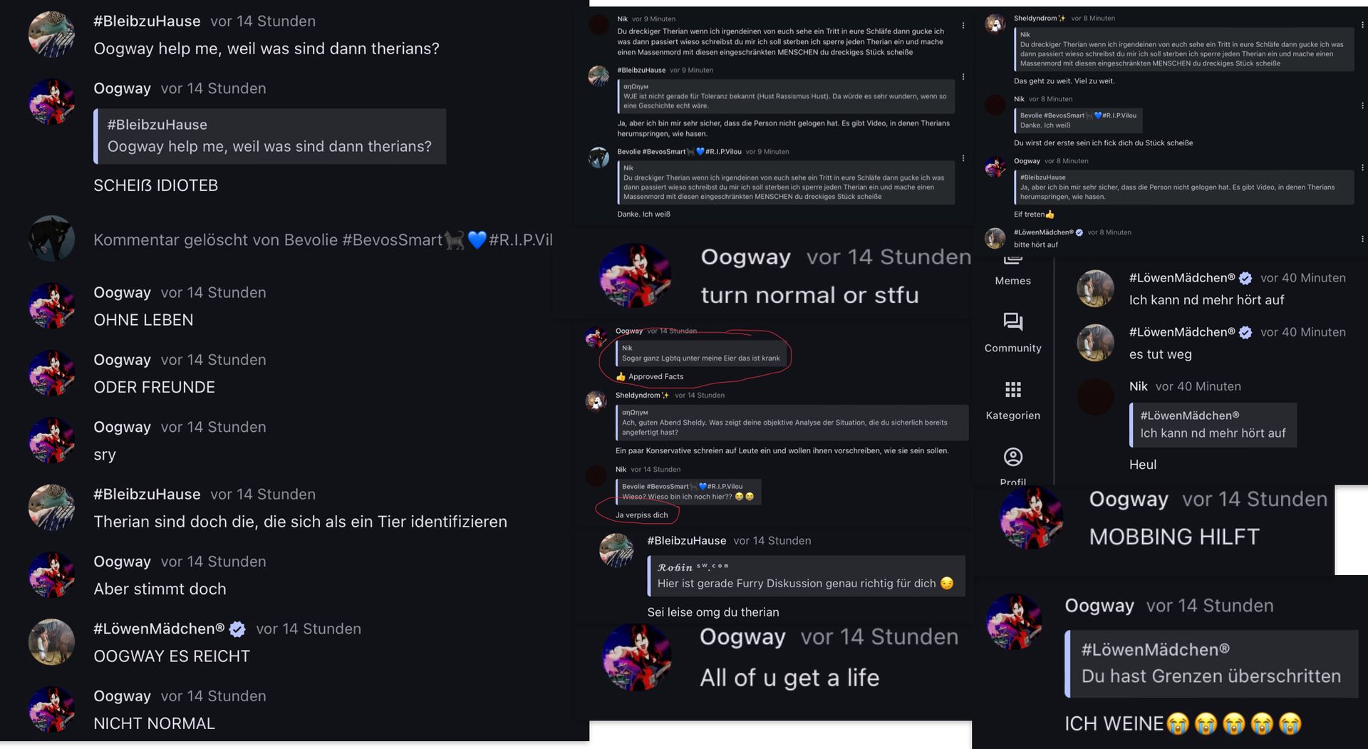 was passiert hier schon wieder... bin echt fassungslos, oogwgay hat ja schon mehrmals klargemacht dass er LGBTQ, und Furries und alles komplett ablehnt. ich akzeptiere seine meinung, und finde auch dass man das ganze in grenzen halten sollte. habe selber therians in der klasse, finde es ist einfach nh quatschige nummer weil wir OFFENSICHTLICH MENSCHEN und KEINE Tiere sind. Also ist es einfach nur eine quatschige Verschwörungstheorie. Es gibt aber auch Leute, die an ganz andere Sachen glauben und jeder kann ja seine Meinung vertreten, so wie auch orthodoxe religiöse Personen. Aber was ich von Nik lesen musste, hat mich wirklich echt schockiert, Robibs Memes mitten random fand ich etwas fragwürdig ._. Aber ich finde, Niks Sperre kann und sollte ruhig viel länger andauern, weil wir solch einen Hass hier nicht tolerieren. Und Bevo und Löwi: Ich kann verstehen, dass ihr euch wegen eurer fragwürdigen Identifikationsstörung angegriffen fühlt, akzeptiere ich auch und verstehe ich, will euch aber lediglich nur mal den Tipp geben: Stellt euch in solchen Situationen nicht immer in der Opferrolle dar, das kommt nie gut an und bringt den „Hatern“ auch noch eine grössere Plattform. Das wollte ich nur mal loswerden, und wünsche euch eine gute Nacht :)