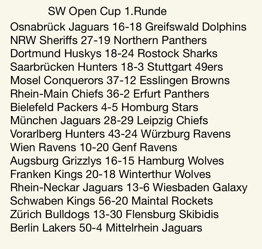 Berlin Lakers vs. Potsdam Goats Schwaben Kings vs. Zürich Bulldogs München Jaguars vs. Augsburg Grizzlys Mosel Conquerors vs. Saarbrücken Hunters