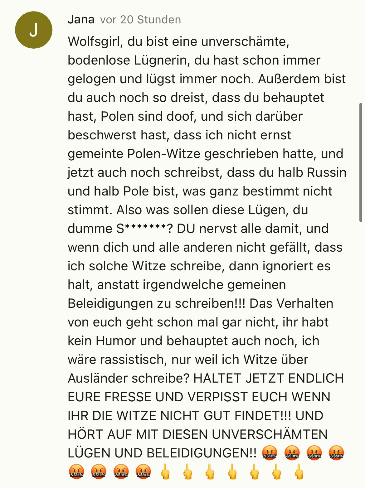JJanavor 3 JahrenHALT JETZT ENDLICH DEIN MAUL DU VERFICKTE LÜGNERIN, DU DUMME SCHEIßSCHLAMPE SONST WIRST DU GEBANNT DU IDIOTIN!!! 🤬 🤬 🤬 🖕 🖕 🖕